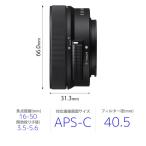 - 種別:ミラーレス用AFレンズ NOTEAPS-C対応の標準パワーズームレンズ『E PZ 16-50mm F3.5-5.6 OSS II』は、焦点距離16mmから50mm(35mm判換算で広角24mmから中望遠75mm相当)をカバーするAPS-C対応の標準パワーズームレンズです。非球面レンズ4枚とED(特殊低分散)ガラス1枚を効果的に配置することにより、高い解像性能を実現しています。最大撮影倍率0.215倍、最短撮影距離は0.25m (ワイド端)/0.30m (テレ端) と近接撮影性能にも優れ、被写体に近寄って大きく撮影できます。また、リトラクタブル機構(収納構造)のため、全長は電源オフ時に約31.3mm、質量は約107gと小型軽量で、携帯性に優れています。さらには、AF性能を強化し、電動によるズーム中のフォーカス追随精度が向上※1しています。カメラ本体のアクティブ手ブレ補正や手ブレ補正の協調制御にも対応※2しているため、動画および静止画撮影時に手ブレを抑えることが可能です。カメラ本体のブリージング補正にも対応※3しています。※1 E PZ 16-50mm F3.5-5.6 OSS比。※2 対応するカメラはソニー公式サイトのサポート情報を参照ください。※3 対応するカメラはソニー公式サイトのサポート情報を参照ください。本機能を[入]にすると画角と画質がわずかに変化します。本機能を[入]にしても、レンズによっては、補正しきれない場合があります。同梱品 :レンズフロントキャップ(ALC-F405S)、レンズリヤキャップ(ALC-R1EM)■主な特徴気軽な日常使いに。動画も静止画も、多彩な表現にこたえるAPS-C標準パワーズームレンズ日常使いで動画も静止画も多彩な映像表現にこたえる、APS-C対応の小型・軽量標準パワーズームレンズです。広角24mmから中望遠75mm相当(*1)までをカバーしながらも、リトラクタブル機構(収納構造)の採用により、電源オフ時に全長31.3mmの薄型化と質量約107gの軽量化で優れた携行性を実現。また、AF性能が強化され、電動によるズーム中のフォーカス追随精度が向上しています。さらに、光学式手ブレ補正機能を内蔵しているため、動画撮影時にも手ブレを抑えた映像を撮影できます。対応するカメラ本体の「ブリージング補正機能」(*2)にも対応しています。*1 35mm判換算*2 互換情報はソニー公式サイトを参照してください。本機能を[入]にすると画角と画質がわずかに変化します。本機能を[入]にしても、レンズによっては、補正しきれない場合があります高い描写性能非球面レンズ4枚とED(特殊低分散)ガラス1枚を含む8群9枚のエレメントの配置を工夫することにより、広角24mmから中望遠75mm相当(*)までズーム全域で高い解像性能を発揮。色にじみも抑えて、被写体をクリアに描きます。* 撮像素子がAPS-Cサイズのレンズ交換式デジタルカメラ装着時の35mm判換算値被写体を際立たせる美しいぼけ描写7枚羽根の円形絞りにより、美しいぼけ描写を実現します。高い近接性能最大撮影倍率0.215倍、最短撮影距離は0.25m(ワイド端)/0.30m(テレ端)と近接撮影性能にも優れ、テーブルフォトなど被写体に近寄って大きく撮影できます。最新ボディの性能を最大に引き出すAF性能最適化されたリニアモーターを搭載し俊敏に制御することで、狙った被写体に高速・高精度なピント合わせができます。動いている子どもやペットの貴重なシャッターチャンスを逃しません。追随性にも優れ、α9 IIIの最高約120コマ/秒(*1)の高速連写にも対応するほか、精緻(ち)なピント合わせが求められる4K 120p/FHD 240p(*2)のハイフレームレート動画撮影時も、被写体を静粛かつなめらかに捉え続けます。*1 ソニー測定条件。撮影条件によっては連続撮影の速度が遅くなります。フォーカスモードがAF-Cのときは、連続撮影の速度が異なります*2 使用するカメラ本体と設定によって異なります。ZV-E10 IIは非対応です進化した動画性能パワーズーム(電動ズーム)を採用し、静かでなめらかなズーミングを可能にします。また、ズーム中のオートフォーカスにも対応。光学式手ブレ補正機能を内蔵し、カメラ本体の電子式手ブレ補正機能「アクティブモード」や手ブレ補正の協調制御にも対応(*1)しているため、動画および静止画撮影時に手ブレを抑えられます。さらに、フォーカスブリージングを抑制(*2)する光学設計により、映像に残る画角の変動や揺れを最小限にし、動画に求められるなめらかな表現を可能にします。*1 対応するカメラはソニー公式サイトのサポート情報を参照ください*2 互換情報はソニー公式サイトを参照してください。本機能を[入]にすると画角と画質がわずかに変化します。本機能を[入]にしても、レンズによっては、補正しきれない場合がありますいつでもどこへでも持ちだせるコンパクトサイズリトラクタブル機構(収納構造)の採用により、電源オフ時に全長31.3mmの薄型化を実現。また、堅牢性を担保しながら全体の軽量化を図り、質量約107gと携行性にも優れています。コンパクトなボディに妥協のない操作性ズームリングとフォーカスリングが一体となったズーム/フォーカスリングを搭載しており、望んだ焦点距離(