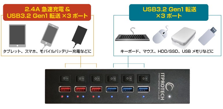 - 6ポート増設:USB3.2接続で、データ転送と急速充電を同時に。