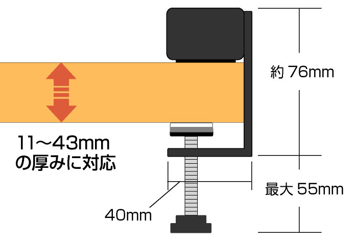 - クランプ固定で簡単設置:11mm〜43mmのクランプ幅で、あらゆるデスクにフィットします。