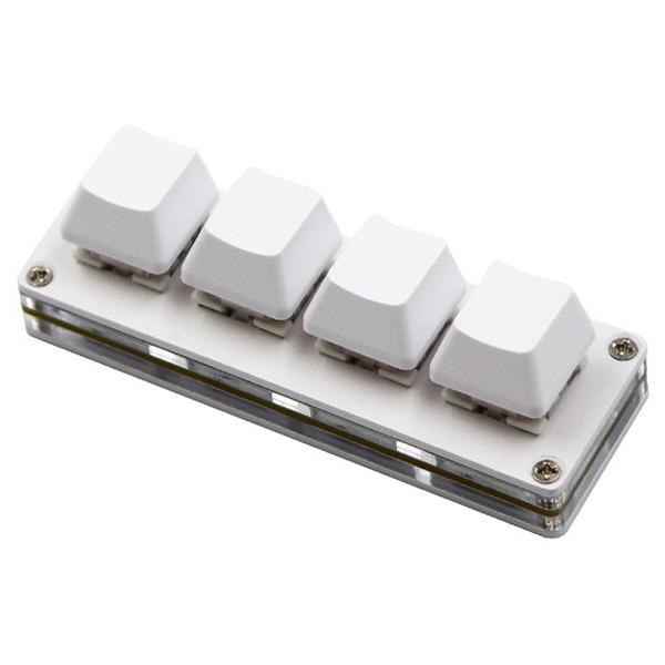 - 4キーのコンパクトキーボードです。専用ソフトを用いて、自由にキーアサイン可能です。Ctrl、Shift、Alt、winを使用するでショートカットを設定することも可能です。■自由にカスタムできる4キー小型キーボード専用ソフトをダウンロードして、よく使用するショートカットなどを各キーに登録すれば作業時間の短縮に役立ちます。オフィス業務の他にも、ゲーム、デザインなど幅広い用途で作業の効率化を図れます。■ショートカットキー割当できる標準のWindowsキーボードすべてのキー機能を自由に設定できます。また、各種デザインソフトにも対応しており様々なショートカットを簡単に作ることができます。■高耐久メカニカルキースイッチ各キーが独立した構造で耐久性に優れています。クリック感がなく滑らかさ・静かさが特長の赤軸メカニカルキースイッチが採用されており、しっかりとした打ち心地となっています。■金属製ベースプレートとType-Cポート重厚感のある金属製ベースプレートが採用されており、安定感抜群です。また、ケーブル接続にはType-Cインターフェースとなっており、挿しやすく抜けにくい仕様です。■RGBバックライトLEDのON/OFFや単色からRGBまで自由に設定できます。イルミネーション方法やバックライトの明るさ調整も可能で、環境に合わせた雰囲気を楽しむことができます。■ホットスワップ対応キースイッチはCherry互換品でホットスワップに対応しています。取り外し可能で、お好みのスイッチに変更することも可能です。