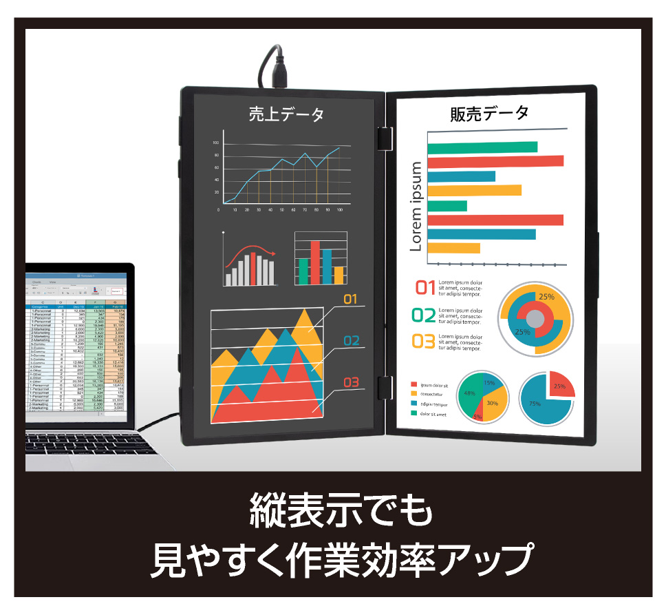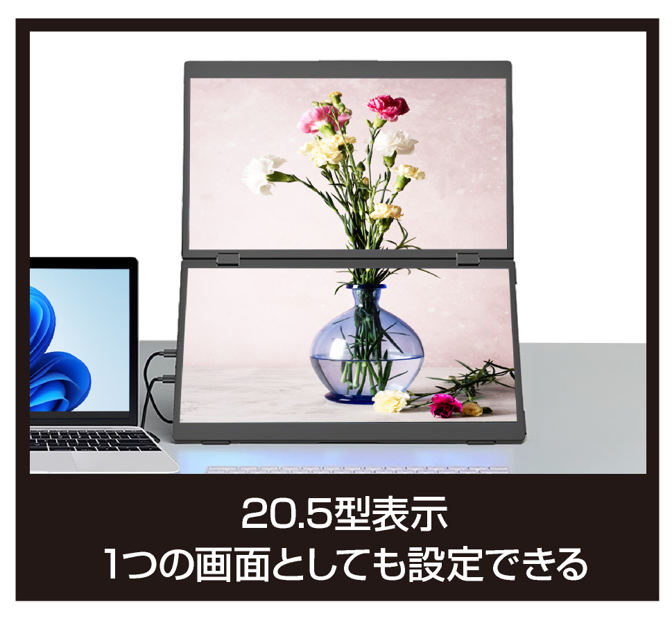 - ●ケーブル1本で画面の拡張や複製 縦使用もできて様々な用途で映像を出力 パソコンと接続すればソフトのインストールやアプリなど使わずにWindowsOSやMacOSの機能を利用してメイン画面を拡張したり複製したりすることができます。また、「USB Type-Cディスプレイ給電」に対応しており、パソコンからの映像出力と給電がケーブル1本(※)で行われます。電源コンセント不要でお使いいただけますので、かんたんに省スペースでのトリプルディスプレイ環境を構築することができます。 ※WindowsOSの仕様上、「マルチディスプレイ」設定の「表示画面を複製する」では3画面を同じ映像で表示することは出来ません。 ※MacOSの仕様上、Type-Cケーブル1本で接続した場合、本製品の2画面それぞれを個別に認識することは出来ません。 ※Type-Cケーブル1本で接続する場合、パソコンに映像出力(DisplayPort Alt Mode)対応のUSB Type-Cポートが必要です。 ※その他、給電が足りない場合は付属の専用USB-ACアダプタをご使用ください。●鮮やかな発色のIPS方式フルHD液晶パネルを搭載 2つのディスプレイ共に広視野角左右上下170度のIPS方式液晶ノングレアパネルを採用しています。また、フルHD映像・動画視聴に最適なアスペクト比16:9、ホワイトLEDバックライト仕様で、白浮きの少ない鮮やかで安定した色調で表示することができます。●相手に見やすく表示できる 画面反転機能 本体側面にデュアルモニターの上画面のみ天地を反転できるスイッチが搭載されています。向かい合った相手と同じ画面を共有することができますので対戦ゲームや卓上プレゼンに最適です。●表示スイッチ搭載 画面ON/OFF機能 本体デュアルモニターそれぞれの側面に画面表示をON/OFFできるスイッチが搭載されています。どちらの画面もスイッチを押せば相手に見せたくない画面を表示しないようにでき、もう1度押せば再度画面を表示することができます。●持ち運びが容易な折り畳み式軽量薄型設計 360 度回転ヒンジを搭載、VESA規格準拠、デュアルスピーカー内蔵、一体型収納スタンド搭載です。■画面数:2画面■パネルタイプ:15.6型 IPS液晶 ノングレア(非光沢)■表示面積:344×193mm(1画面あたり)■解像度:1920×1080(1画面あたり) ■入力解像度:1920×1080 最大60Hz(画面分割)/1920×2160 最大30Hz(フルスクリーン)■アスペクト比:16:9■輝度:250cd/m^2■コントラスト:800:1■視野角:170度■発色数:1.677万色■バックライト:LED■入力信号:Type-C(DisplayPort Alt Mode)、HDMI■入力端子:USB Type-C(映像&給電)×2、USB Type-C(映像)、mini HDMI(映像)■内蔵スピーカー:1W×2(ステレオ)■外形寸法:画面展開時:約 横360x縦440x厚さ7mm/9mm(突起部除く)■収納時:約 横360x縦220×厚さ16mm(突起部除く)■重量:約1585g(本体のみ)■温度・湿度:動作温度5〜35℃、湿度20〜80% ※結露なきこと■付属品:USB-ACアダプタ、HDMIケーブル、USB Type-C to Type-Cケーブル×2、USB Type-A to Type-Cケーブル