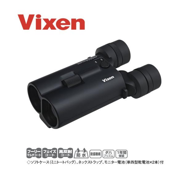 - 種別:双眼鏡 NOTE倍率14倍、対物レンズ口径42mmを採用。より大きく、より明るく、そして手ブレのない視界で対象をとらえることを目指した、ビクセン防振双眼鏡のフラッグシップモデルです。ミニトートバッグ型ケースミニトートバッグ型のケースが付属。巾着ケース で 、ストラップなども一緒にスッキリと収納できます。付属品:ソフトケース(ミニトートバッグ)、ネックストラップ、モニター電池(単四乾電池×2本)■主な特徴2種類の「防振機構」を搭載》アテラH14×42WP は、2軸ジンバル制御防振機構による手ブレ補正機能を搭載。高倍率14倍でも、手ブレを抑えた鮮明な像で対象をとらえることを可能にします。防振補正角±2度(上下左右)。お使いの状況に合わせて2種類の防振モードから選択可能です。より防振効果が得られるモードで安定した視界が得られます。V1 モード:小刻みで微小な揺れを抑えるのに適した防振モードV2 モード:ゆっくりとした大きな揺れを抑えるのに適したモード3種類のコーティングによるクリアな視界レンズ全面に反射防止多層膜コーティングを施したフーリーマルチコートを採用。プリズム面 にはハレーションを低減し解像度を劇的にアップするフェイズコートと像の「明るさ」を高める高反射コートの2つを採用しています。これら3つのコーティングにより、双眼鏡内での迷光や光量ロスを徹底排除し、くっきり と した極めてクリアな視界で対象をご覧いただけます。大口径モデルながら扱いやすい形状ボディデザインにストレート円筒形状を採用。扱いにくくなりがちな大口径モデルながら、しっかりと優れたホールド性を実現しました。片手で持ちながら指先だけのライトタッチでスムーズなピント操作が可能です。また、左右の「利き手」を選ばないユニバーサルデザインを採用しています。単四電池2本、30時間、オートパワーオフ90分電源は全国どこでも入手しやすい単四電池×2本で、約30時間という長時間の連続使用が可能です。また、電源を入れてから一定時間( 90分)が経過すると自動的に電源が切れるオートパワーオフ機能搭載。消し忘れによる電池切れを防ぎます。紛失防止を考えて、電池蓋は本体一体型になっています。※新品アルカリ乾電池、気温20 ℃で使用の場合生活防水仕様屋内外を問わず活躍する防水仕様です。(光学系本体IPX4 相当の防水)■主な仕様倍率:14倍対物レンズ有効径:42mm(最大)プリズム材質:BK7(ダハプリズム)、BaK4(補助プリズムコーティング:フーリーマルチコート、フェイズコート、高反射コート実視界:3.8度見掛視界:53.2(49.8 ※)1000m先視界:66mひとみ径:3mm(最大)明るさ:8.3アイレリーフ:14mm眼幅:55~75mm至近距離:約4m三脚取付:不可電池:単四型アルカリ乾電池×2電池・持続時間:約30時間防水性:有りサイズ:18.1×11.7×6.8cm重さ:559g(電池別)※JIS B7157:2003に準拠して計算しています。