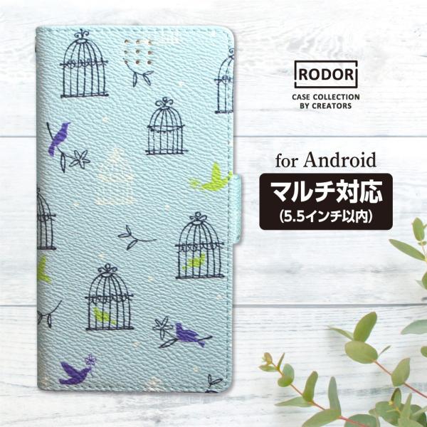 スマホケース 手帳型 北欧 おしゃれ 他機種 マルチ対応 Android アンドロイド 5.5インチ PUレザー / トリ:ライトブルー