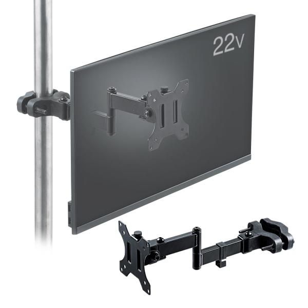 - 支柱に液晶ディスプレイを1画面設置できるポール取付けタイプのモニターアームです。32インチまで対応。アームの長い4関節タイプで、モニターの上下・左右調整や回転も可能です。<特長>●直径28〜60mmの丸パイプに取付け可能なモニターアームです。●VESA規格に準拠し、75×75mmおよび100×100mmの取付け穴を有する液晶ディスプレイがマウントできます。●モニターの向きを任意の方向へ向けることができます。●ディスプレイ取付け部は360°回転可能です。<仕様>■サイズ:寸法図参照■重量:960g■カラー:ブラック■取付け場所:支柱・ポール■対応ポール径:直径28〜60mmの丸パイプ■画面数:1■対応モニターサイズ:最大32インチ■対応モニター重量:最大8kg■総耐荷重:8kg■アーム長:269mm■可動範囲/液晶モニター:左右180°、上下各30°、360°回転■出荷形態:ノックダウン組立式■個口数:1個口■材質:スチール、プラスチック■付属品:ディスプレイ取付けネジ4種×4本、スペーサー4個、ワッシャー4個、ケーブルフック1個■取説:あり(日本語)■原産国:中国<注意事項>・小口輸入品につき、運搬中に製品、箱などに汚れ、キズができる場合がございます。・アームに8kgを超える機器は取付けしないでください。・想定されるディスプレイサイズは、一般的な目安を示しています。取付けにおいてはディスプレイの重量と耐荷重を基準として選定してください。フレーム幅等の違いにより、対応インチサイズであっても取付けできない場合もございます。モニターアーム 比較表一覧仕様違い大型3関節・スプリング内蔵2関節・スプリング内蔵4関節2関節