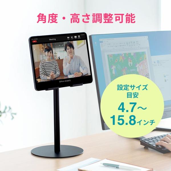 - iPadなどのタブレットやスマートフォン・モバイルモニターなど様々な機器を机上や床置き設置できるマルチスタンドです。高さや角度が調整できるので、機器の画面を見やすく、自然な姿勢で使うことができます。<特長>●自分の見やすい位置、カメラ替わりの設置に役立つ高さや角度調節ができるスタンドです。●高さ調整は無段階で調整できます。●4.7インチ〜15.8インチ程度の機器に対応しています。●角度の調整も無段階で調整可能です。●充電しながら使えるように中央部にはケーブル口を付けています。<仕様>■製品サイズ(外寸):約W180×D180×H340〜510mm■支柱直径サイズ:直径2cm、直径1.4cm■製品重量:約1.07kg■材質:スチール、プラスチック、ゴム■製品カラー:ブラック■総耐荷重:1kg■対応サイズ:厚み10mmまでタブレット、スマートフォン、モバイルディスプレイ■取扱説明書:あり(日本語)■保証:初期不良のみ ■原産国:中国・小口輸入品につき、運搬の際製品、箱などに汚れ、キズができる場合がございます。<関連キーワード>タブレットスタンド,iPad,モバイルモニター,縦置き,床置き,角度調整,高さ調整,テレワーク