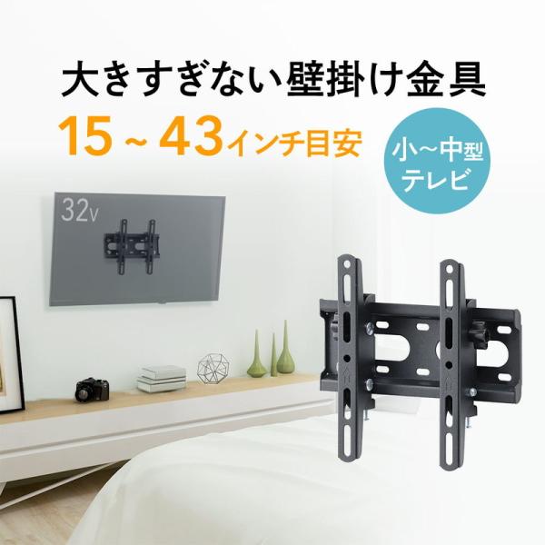 - 小さめのテレビを設置しても、テレビ裏に金具がすっぽり収まる壁掛け金具です。<特長>●小さめのテレビを設置しても、金具が飛び出ず、テレビ裏にすっぽり収まる小型の壁掛け金具です。●壁からの出っ張りが少ない薄型の金具です。●上下の角度調整ができるので、見やすい角度に調整できます。●取り付け時に設定することで縦向きにテレビを取り付けることにも対応しています。●耐荷重45kgでしっかり支えます。<仕様>■製品サイズ:W240×D223×H53mm■製品重量:0.9kg■上下角度調節(チルト):上12°、下12°■製品パッケージサイズ:W257×D105×H53mm■製品パッケージ重量(製品含む):約1kg■材質:スチール、粉体塗装■付属品:ディスプレイ取り付けネジ■製品カラー:ブラック■対応モニタサイズ_43インチまで(目安)■対応ディスプレイ重量:45kg■保証:6ヶ月■原産国:中国■取扱説明書:あり(日本語)※モニター・テレビにより、対応可否がございます。必ず対応のご確認をお願いします。弊社対応表にないテレビ・ディスプレイ型番での対応不可による返品や保証はお受けできませんので、予めご了承下さい。■対応モニターサイズ:15・15.6・16・17・18.5・19・19.5・20・20.7・21・21.5・22・23・23.8・24・26・27・28・29・31・5・32・34・40・42・43・45・46・47・49・50インチ目安※モニターの耐荷重 45kg■参考対応テレビメーカー:SONY(BRAVIA),パナソニック(VIERA),TVS REGZA(REGZA),ハイセンス,東芝,シャープ(AQUOS),TCL,LGエレクトロニクス(LG Electronics),山善,FPD,maxzen,IO DATA,三菱電機(REAL・カンタンサイネージ),日立(Wooo),NEC,サムスン,ユニテク,ジュワイユ,iiyama,BenQ,オリオン,フィリップス,maxzen,ドウシシャ,モダンデコ,ドンキホーテ,SANSUI,DMM,neXXion(ネクシオン),GRANPLE,アイリスオーヤマ(LUCA),JAPANNEXT,FUNAI,Xiaomi(シャオミ)など■対応VESA規格(横×縦):100×100、100×200、200×100、200×200mm※本製品の取り付けには特別な技術が必要ですので、必ず専門業者へご依頼ください。お客様による工事は一切行わないでください。・小口輸入品につき、運搬の際製品、箱などに汚れ、キズができる場合がございます。・可動部分で指などを挟まないよう、十分ご注意ください。・作業は必ず大人二人以上で行ってください。・取扱説明書で指定しているボルト類や固定具は全数を確実に取付けてください。・取付け不備や取扱い不備による事故や損傷については、当社は責任を負いません。・必ずコンクリートの壁か、もしくは壁の内部に木製の芯材がある場所に取付けてください。壁面はディスプレイと本製品を合わせた荷重に長期間耐える十分な強度が必要です。・45kgを超える機器は取付けないでください。・用途以外で使用しないでください。<関連キーワード>テレビ壁掛け金具,薄型,角度調整,チルト,汎用,VESA,液晶,ディスプレイ,モニター,インチラインナップ【壁掛け金具】対応目安:32~72型対応目安:~80型対応目安:~70型対応目安:15~43型対応目安:32~75型対応目安:32~65型対応目安:50~84型対応目安:32~65型対応目安:32~70型対応目安:32~52型