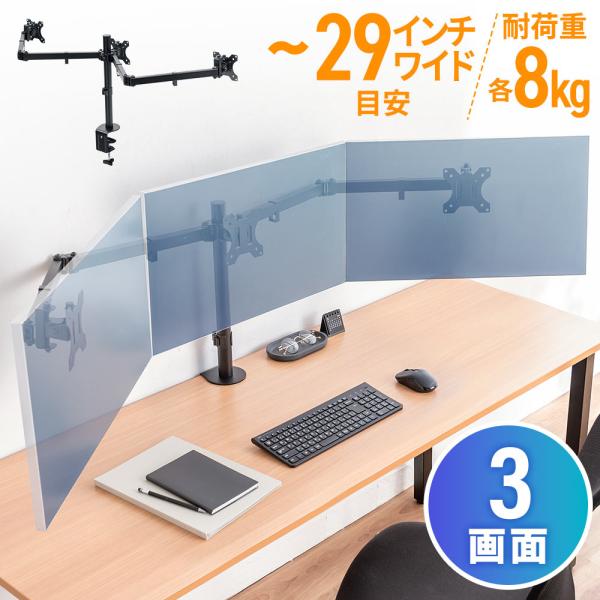 - 3画面を横並びでまとめて設置できるモニターアーム。角度・高さ調整・回転可能です。<特長>●3台のモニターを横並びに設置できる3画面対応のモニターアームです。●モニターの向きは縦・横、組み合わせて使用できます。●アームの関節が可動するので、モニターの位置・角度などが調整できます。高さ変更も可能です。●左右のモニターは高さの微調整ができるので、画面の高さを揃えることができます。●ケーブルホルダー付きで、配線をまとめることができます。●VESA規格対応。<仕様>■サイズ:寸法図参照■重量:約5kg■製品パッケージサイズ:W460×D275×H130mm■製品パッケージ重量:約6kg■材質:スチール/アルミ/プラスチック■可動範囲:画面上下(チルト)/上下各90°、画面左右(パン)/左右各90°、画面回転(ローテーション)/360°■総耐荷重:24kg(1アームに付き 8kg)湾曲モニターはその構造上、平面モニターに比べモニターアームに負荷がかかりやすいため、耐荷重に余裕のあるモニターアームをお選びください。■付属品:モニター取付け用ボルト、ケーブルホルダー、六角レンチ(4mm・5mm・6mm)■保証期間:初期不良のみ■原産国:中国■取扱説明書:あり(日本語)■対応モニターサイズ:15・15.6・16・17・18.5・19・19.5・20・20.7・21・21.5・22・23・23.8・24・26・27インチなど※モニターの耐荷重 各8kg(総耐荷重24kg)※湾曲モニターはその構造上、平面モニターに比べモニターアームに負荷がかかりやすいため、 耐荷重に余裕のあるモニターアームをお選びください。■対応モニター参考メーカーIO DATA(IOデータ)、TVS REGZA(REGZA)、lenovo、AIWA、DELL(デル)、JAPAN NEXT、Minifire、Pixio、アトランティス(ATLANTIS)、iiyama(イイヤマ)、AOC、Acer(エイサー)、ASUS(エイスース、アスース)、EIZO(ナナオ)、MSI(エムエスアイ)、HP(ヒューレッド、パッカード)、LGエレクトロニクス(LG Electronics)、シャープ(SHARP)、フィリップス(PHILIPS)、ドウシシャ(DOSHISHA)、ViewSonic(ビューテック)、BenQ(ベンキュー)など■VESA:75×75、100×100(mm)・小口輸入品につき、運搬の際製品、箱などに汚れ、キズができる場合がございます。<関連キーワード>モニターアーム 3画面 クランプ 左右 前後 ポール 縦画面 VESA グロメット トリプルディスプレイ 多画面設置 デスクマウント 液晶ディスプレイアーム 高さ調整機能 角度調整機能 回転機能 ケーブルホルダー付き 耐荷重24kg 15〜27インチ対応 スチール製 組立簡単 オフィス用 在宅勤務 ゲーミング環境 映像編集 株式トレードラインナップ3画面3画面3画面4画面