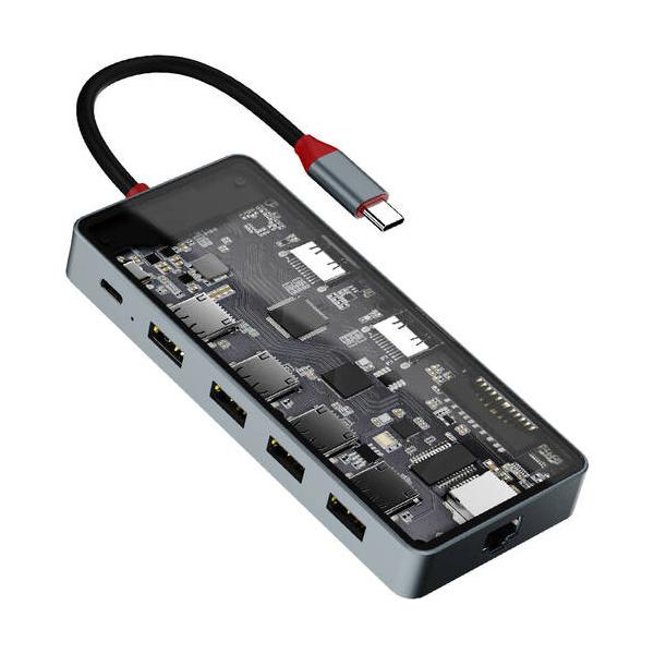 - 本製品は金属ボディの天板を高透明度のパネル設計になっており、内部基盤がみえるシースルー構造になっている新感覚デザインのUSBマルチ機能HUBです。USB3.0ポートを3つ、USB2.0ポートを1つ、HDMI映像出力を2つ、カードリーダー(SD/MicroSD対応)、ギガビットLANアダプタを備えます。PD100Wに対応する充電専用のTypeCポートも備えるので、コネクタが1つしかない機器でも充電しながら使う事も可能です。■内部基盤が見えるシースルー構造金属ボディの天板を高透明度のパネル設計になっており、内部基盤がみえるシースルー構造になっている新感覚デザインのUSBマルチ機能HUBです。■各ポートアクセスランプを搭載それぞれのポートにデバイスを接続した時に、ポートのLEDが点灯します。見た目で現在接続しているデバイスを把握しやすく、シースルー構造を生かした特徴になります。 ■コンパクトなデザイン多機能でありながら、非常にコンパクトにデザインされており、ノートパソコンと持ち運ぶときも邪魔になりません。 ■便利なSD/MicroSDカードリーダー機能SDカードとMicroSDカードを読み書きするカードリーダー機能を搭載しております。ノートパソコンやタブレットがどんどん薄型化でカードリーダー機能搭載するモデルがどんどん減っております。その中でカメラで撮影した動画や写真を転送する際に便利なカードリーダーを搭載することで、大量なデータを簡単にパソコンに転送することができます。 ■同時接続可能なUSB Aポート搭載ノートパソコンやタブレットでは限られているUSBポートを増やすことが可能です。汎用性が高いUSB Aポートを増設することで様々なデバイスを接続が可能になります。■ギガビットLANを増設ギガビットLANポートを備えており、ノートパソコンに優先ギガビットLANを増設することで、ワイヤレスでは実現できない安定した高速通信が可能になります。 ■HDMIで映像出力が可能本体にHDMIポートがあり、TypeCでノートパソコンに接続することで、ノートパソコンのデスクトップ画面を外付けモニターに出力することが可能です。より大きな画面でコンテンツを楽しんだり、広い作業領域で仕事をするなどが可能です。 ■PowerDeliveryに対応PCのTypeCポートが電源入力に対応している場合、TypeC電源入力に対応(PowerDelivery最大100W)いたします。貴重なTypeCポートを最大限有効活用いただけます。