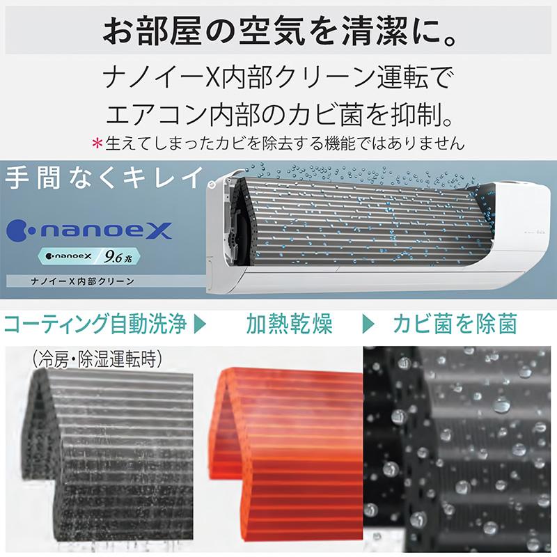 - 発売時期2026年1月16日【商品詳細】ナノイーX搭載、スタンダードモデルナノイーXでお部屋もエアコン内部も清潔・ナノイーXを生かしてお部屋の有害物質を抑制・ナノイーX内部クリーン運転で内部のカビ抑制夏も冬も快適な冷暖房・天井シャワー気流で直接体に冷風をあてない・熱中症の増加を背景に、室温みはりの制御を改善・サーキュレーションモードでムラなくあたため「エオリアアプリ」で操作が簡単・便利・IoTセキュリティ制度 JC-STAR 適合ラベル 取得・便利な新機能がアプリでも使える・継続的なアップデートで使うたびに便利に【仕様】電源 単相100V電源プラグ 外形寸法(高さ×幅×奥行) 室内機 290×780×229mm室外機★1 539×655×275mm質量 室内機 8.5kg室外機 20kg配管パイプ(管径mm) 液側 φ6.35(2分)ガス側 φ9.52(3分)配管長(最大) 20m高低差 12m適用畳数 8畳冷房 冷房能力 2.5(0.5~2.9)kW畳数の目安 7~10畳(11~17平方メートル)消費電力 680(135~740)W運転音(音響レベル) 室内機 60dB室外機 58dB暖房 暖房能力 2.8(0.4~4.1)kW外気温2℃時の暖房能力 3kW畳数の目安 6~8畳(10~13平方メートル)消費電力 630(125~1280)W運転音(音響レベル) 室内機 61dB室外機 58dB消費電力量の目安(JIS C9612:2013) 冷房時 252kWh暖房時 563kWh期間合計 815kWhAPF 5.8新省エネ基準(JIS C9612:2013) 区分 I達成率 87%寒冷地対応 一般地機能 冷媒 冷媒 R32室外機 高外気温50℃対応※冷房能力を保証するものではありません。ナノイー ナノイーX 9.6兆清潔 抗菌エアフィルター(Ag+)熱交換器(親水コート)ナノイーX内部クリーンおでかけクリーンにおいケア気流 左右風向自動パワフルスイング暖房冷房 共通 新室温みはり暖房 サーキュレーションモードすぐでる暖房(おはようチャージ)冷房 快速制御(温度シフト)天井シャワー気流すぐでる冷房除湿 2モード除湿(除湿/除湿 弱)タイマー 入切タイマー(同時入切)おやすみ切タイマーリモコン 0.5℃刻み便利 パワーセーブモード(常時)スマホ連携 エオリアアプリ無線LAN内蔵JC-STAR★1シーン推定自動運転機能加湿空気清浄機連携消費電力量の目安(JIS C9612:2005) 冷房時 221kWh暖房時 643kWh期間合計 864kWhAPF 5.8その他の付記事項★2 右の室外機寸法には、バルブカバー部、グリル部、脚部などの寸法が含まれていません。 実際の寸法についてはカタログ等でのご確認をお願いいたします。初期不良交換対応、メーカー修理サービス対応。