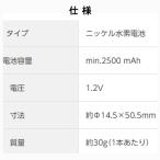 - ■商品特徴 ・高容量で、長時間機器を使いたい方に最適。容量:min.2500mAh※1 ・自然放電が少ないので、充電しておけば1年後約85%※2の容量維持 ・低温特性にすぐれ、マイナス20度の寒い場所でも性能発揮。使用温度範囲:-20℃~50℃ ※1 JIS C8708 2019(7.3.2)の充放電条件に基づく電池の最小(min.)容量 ※2 満充電して、室温(20℃)での保存後。保存条件や機器により使用時間は短くなる場合があります。その際には充電してからご使用ください ■商品仕様 ・タイプ:ニッケル水素電池 ・電池容量:min.2500 mAh ・電圧:1.2V ・寸法:約Ф14.5×50.5mm ・質量:約30g(1本あたり)■商品特徴 ・高容量で、長時間機器を使いたい方に最適。容量:min.2500mAh※1 ・自然放電が少ないので、充電しておけば1年後約85%※2の容量維持 ・低温特性にすぐれ、マイナス20度の寒い場所でも性能発揮。使用温度範囲:-20℃~50℃ ※1 JIS C8708 2019(7.3.2)の充放電条件に基づく電池の最小(min.)容量 ※2 満充電して、室温(20℃)での保存後。保存条件や機器により使用時間は短くなる場合があります。その際には充電してからご使用ください ■商品仕様 ・タイプ:ニッケル水素電池 ・電池容量:min.2500 mAh ・電圧:1.2V ・寸法:約Ф14.5×50.5mm ・質量:約30g(1本あたり)
