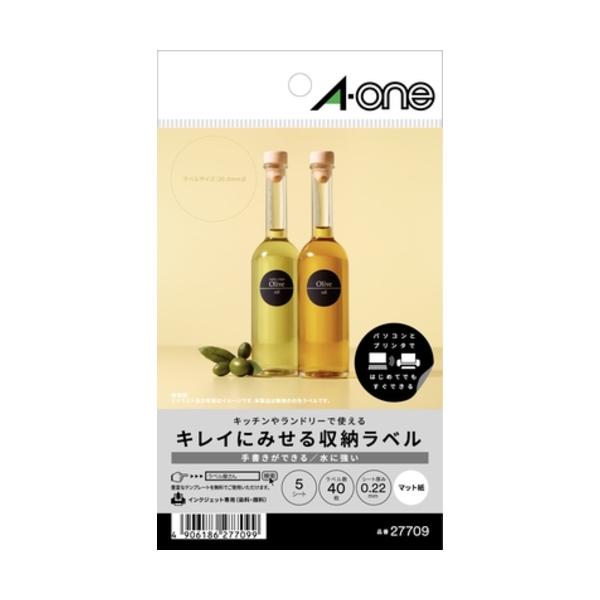 - [エーワン キレイにみせる収納ラベル 水に強い マット紙 8面 丸型 はがきサイズ 5シート(40片)入り 27709]の商品説明●インクジェットプリンタで印刷した文字やイラストが水に濡れても滲まず、キッチンやランドリーでご使用いただけます。●豊富なテンプレートで自分だけの収納ラベルが簡単に作成できます。[エーワン キレイにみせる収納ラベル 水に強い マット紙 8面 丸型 はがきサイズ 5シート(40片)入り 27709]のスペック●入数:5シート(40片)●シートサイズ:はがきサイズ(100×148mm)●1片サイズ:30mmφ●面付け:8面●用紙特性:マット・キレイにはがせる・水に強い○返品不可対象商品