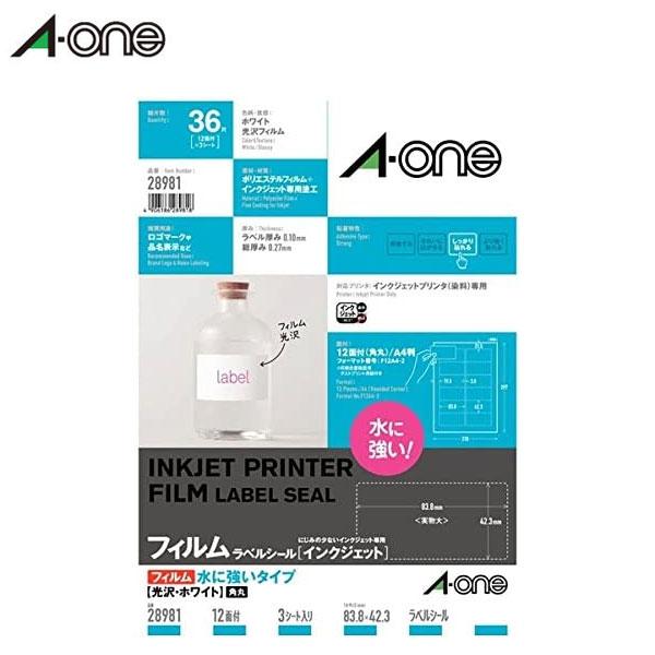 【A4サイズ】エーワン/インクジェットプリンタ対応ラベル(28981)12面 3シート・36片 四辺余白付 角丸 水に強いタイプ 光沢フィルム・ホワイト/A-one