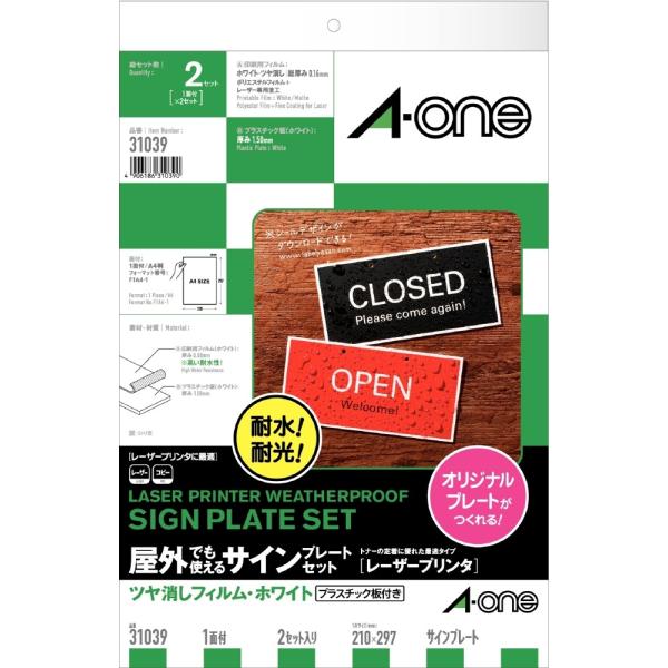 エーワン 屋外でも使えるサインプレートセット[レーザープリンタ] ホワイトフィルムラベル + プラスチック板 A4 1面 ノーカット品番31039