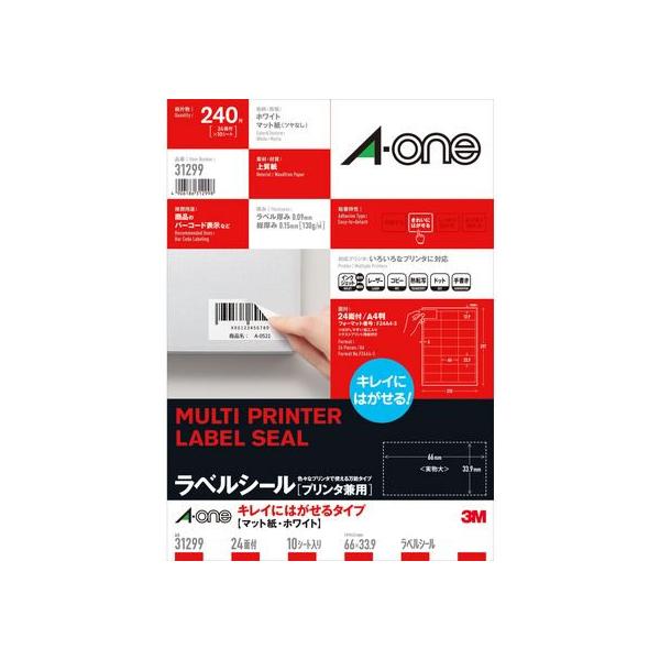 - 【商品解説】●はがせるしっかり貼れて、はがしたいときにはキレイにはがせる糊を使った、プリンタで印刷できるラベルシールです。●上質紙落ち着きがあり自然な仕上がりになる上質紙です。●利用シーン備品や収納、JANコード用ラベルなどのアプリケーションに最適なサイズ。すぐにはがれたりしないので備品用ラベルとしても使えます。●いろいろなプリンタで使える使用するプリンタの種類がわからないときにおすすめ。インクジェットプリンタ、レーザープリンタ、コピー機などで印刷できるプリンタ兼用タイプ。●ソフト無料で使えるエーワン製品専用のラベル&カード作成ソフト「ラベル屋さん」は、豊富なデザインテンプレートや素材も無料でご利用いただけます。Web版はインストール不要。ホームページ上ですぐご利用いただけます。【スペック】●型式:31299(31299)●JANコード:4906186312998サイズ:A4サイズ:シートサイズ:A4判 (210×297mm)一片サイズ:66mm×33.9mm枚数:10シート(240片)面付き:24面 3列×8段紙質:マット対応プリンタ:インクジェット(染料・顔料)、レーザー、コピー、熱転写、ドット、手書き仕様1:・四辺余白付[厚み]130g/m2(0.15mm)[ラベル・カード厚み]0.09mm[材質]上質紙[白色度]90%[用紙特性]マット[粘着特性]きれいにはがせる・FSCミックス認証紙使用商品・GPNエコ商品ねっと掲載この商品は宅配便でお届けする商品です出荷可能日から最短日時でお届けします。※出荷完了次第メールをお送りします。配送サービス提供エリアを調べることができます「エリア検索」をクリックして、表示された画面にお届け先の郵便番号7桁を入力してください。ご購入可能エリア検索お買い上げ合計3,980円以上で送料無料となります。※3,980円未満の場合は、一律550円(税込)となります。●出荷可能日から最短日時でお届けします。(日時指定は出来ません。) ※お届け時に不在だった場合は、「ご不在連絡票」が投函されます。 「ご不在連絡票」に記載された宅配業者の連絡先へ、再配達のご依頼をお願いいたします。●お届けは玄関先までとなります。●宅配便でお届けする商品をご購入の場合、不用品リサイクル回収はお受けしておりません。●全て揃い次第の出荷となりますので、2種類以上、または2個以上でのご注文の場合、出荷が遅れる場合があります。詳細はこちら■商品のお届けについて商品の到着日については、出荷完了メール内のリンク(宅配業者お荷物お問い合わせサービス)にてご確認ください。詳しいお届け目安を確認する1度の注文で複数の配送先にお届けすることは出来ません。※注文時に「複数の送付先に送る」で2箇所以上への配送先を設定した場合、すべてキャンセルとさせていただきます。