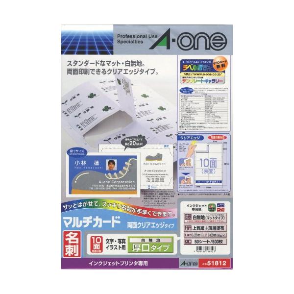 - 商品名 マルチカード名刺用紙 両面クリアエッジタイプ 白無地 厚口 A4判 10面 50シート(500枚)入り 品番 51812 仕様 特長:インクジェットプリンタでの印字適性に優れた名刺用紙です。印刷後にセパレータ(裏紙)をはがすことで、名刺サイズに切り離せるクリアエッジタイプです。名刺だけでなく幅広い用途で使える、白無地タイプでやや厚みのある用紙です。 ●インクジェットプリンタ専用(染料インク) ●用紙特性:マット・両面印刷 ●シートサイズ:A4判(210×297mm) ●一片サイズ:91×55mm ●面付:10面 2列×5段 ●標準総厚み:280g/m2(0.325mm) ●カード厚み:0.26mm ●材質:上質紙+薄層塗布 ●白色度:95% ●入数:50シート(500枚) ●GPNエコ商品ねっと掲載品 メーカー名 エーワン
