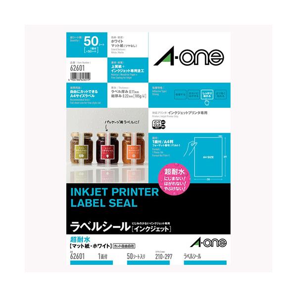 エーワン 62601 ラベルシール[インクジェット] 超耐水マット・ホワイト A4判 1面 ノーカット 50シート