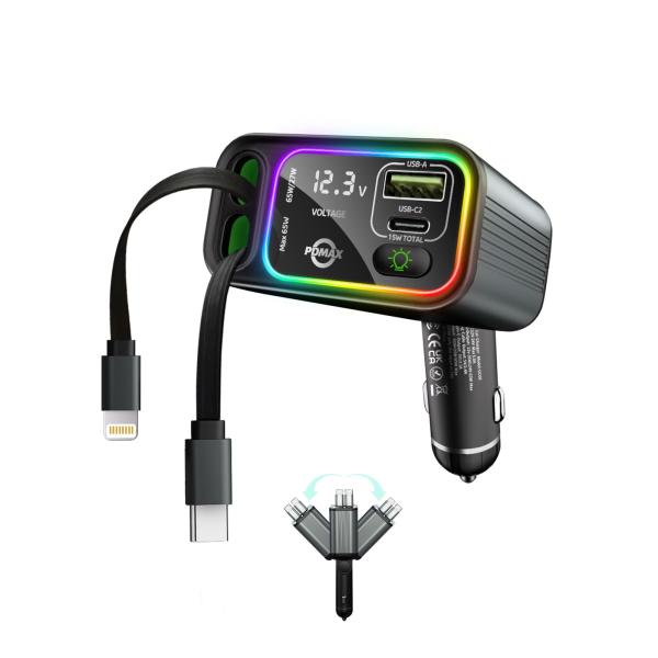- 【便利なデュアル巻き取り式ケーブル】PDMAXシガーソケットチャージャーは、USB-CケーブルとLightningケーブルを搭載し、最大76cmまで伸縮可能です。巻き取り式のデザインは車内を整理整頓し、ケーブルが絡まる煩わしさを解消します。120°調節可能な機能により、ケーブルをどの方向にも向けることができ、デバイスの接続や充電が簡単に行えます。 【マルチデバイス充電用4 in 1カーチャージャー】PDMAXの車用充電器、2つのポート(USB A + USB C)と2本のケーブル(Type-C + Lightning)を備えています。4-in-1機能により、2台のデバイスの同時充電や同乗者との共有が可能です。107Wの強力な出力で、このカーチャージャーは迅速かつ効率的な充電を提供します。標準的な車両ではPDポート経由で最大36W、Lightningケーブル経由で最大27W、24V入力時には(一般的にトラックのシガーライターソケットで使用される)、USB-Cケーブルは最大65W。旅行中もすべてのデバイスの電源が確保されます。車内に散らばる複数の充電器に別れを告げ、車充電器1台で充電の必要性を簡素化しましょう。 【カラフルなアンビエントライト】車のシガーライターソケットに差し込むと、車の電源がオンになったときにカーチャージャーのアンビエントライトが点灯します。内蔵のカラフルなアンビエント照明は、単なる美的機能ではありません。メインライトを点灯しなくても、デバイスの操作や車内のアイテムを探すのに十分な明るさを提供し、夜間のドライブで実用的なツールとして役立ちます。インジケーターライトをクリックするとカラーアンビエントライト、2回目でホワイトライト、3回目で照明モードがオフに切り替わり、異なる充電体験を楽しめます。 【リアルタイム電圧表示による安全性の向上】 PDMAX車 充電器 シガーソケットのリアルタイム電圧表示で、車のバッテリーの健康状態を常に把握できます。低電圧の点滅アラートは、あなたの車が最適な状態を維持することを保証し、セキュリティの追加レイヤーを提供します。
