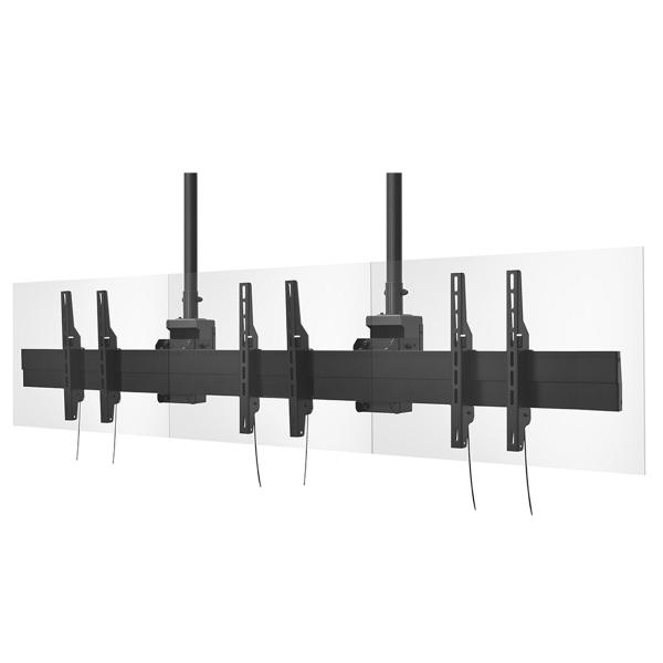 - ※返品についてディスプレイ天吊金具(ハンガー)対応サイズ43〜48型 面数3面DH-530軽量でデザイン性に優れたアルミフレームを採用。最大3連横並びのマルチ画面設置に対応。圧倒的な施工性の向上を図ったフラットパネルディスプレイ用の天吊金具(ハンガー)。■主な特長・最大3連横並びのマルチ画面設置に対応可能なディスプレイ天吊金具(ハンガー)。・軽量・デザイン性に優れたアルミフレームを採用。・搭載するディスプレイの面数・サイズ・質量に応じて8型式から選択が可能。・2面以上のマルチ設置もフレームの長さが変わるだけで、同じ作業にて施工・設置が可能。・ディスプレイ背面にVESA規格の取付金具(ユニバーサルアタッチメント)2個を取り付け、あらかじめ天井に施工したアルミフレームに引っ掛け固定する簡単かつ安全な施工仕様。軽量作業で施工者の負担も軽減。・ユニバーサルアタッチメントには施工時の簡易ロック用にバネを採用することで良好な作業性を実現。 (最終固定はボルト止めの安全設計)・3段階の画面傾斜角度調整が可能。(0°、10°、20°)・設置後に天吊金具本体を360°回転可能。(吊点数1本タイプ)・本体内にダブルコンセント付属。(同梱数量は下表を参照)。・豊富なパイプセット(別売)で、天井高に応じた設置が容易。パイプ長のセミオーダーにも対応。・パイプ内にケーブル類を通線できることで外観に配慮。・従来品DH-460やDH-300とパイプセットが供用のため、交換設置が容易。・オプションのセットトップボックス収納ケース(D-B01、DH-30B)を利用して、STBや小型PCなどの収納も可能。■スペック比較表(メーカー保証:10年) ディスプレイ面数 1面 2面 3面 対応ディスプレイ サイズ ※1 43〜65型 66〜86型 43〜55型 56〜86型 43〜48型 49〜55型 56〜65型 66〜86型 製品型式 DH-510 DH-511 DH-520 DH-521 DH-530 DH-531 DH-532 DH-533 天吊金具 本体個数 (吊点数) 1 2 3 最大搭載質量(kg) 70 140 210 アルミフレーム 長さ(mm) 700 900 1800 2800 2800 3100 4000 4700 ディスプレイ 1面あたり 最大搭載質量(kg) 70 35 70 46 70 傾斜角度調整 0°、10°、20°(3段階) 主要材質 スチール、アルミ、樹脂 表面処理 三価黒メッキ、黒アルマイト 外観色 ブラック(日塗工 N-10)相当 ディスプレイ 設置形態 片面・横設置 取付金具調整量 チルト±1°、高さ±2mm、前後±2mm 高さ調整 パイプセット側にて50mmピッチ4段階調整 ディスプレイ 取付仕様 ユニバーサルアタッチメント 対応ねじピッチ (mm) VESA 300×100 〜600×400 VESA 300×100 〜400×400 VESA 300×100 〜600×400 VESA 300×100 〜400×400 VESA 300×100 〜 600×400 外形寸法(mm) W712 H470 D243 W912 H470 D243 W1812 H470 D243 W2812 H470 D243 W2812 H470 D243 W3112 H470 D243 W4012 H470 D243 W4012 H470 D243 製品質量 (kg) 9.5 10.3 15.7 24.0 26.1 27.2 30.5 37.7 付属コンセント 仕様 125V・15A(合計1500W以下) 付属品 ・ディスプレイ取付用ねじセット: 1×面数 ・製品組立用ねじセット: 1×吊点数 ・天井化粧アダプター: 1×吊点数 ・ダブルコンセント 15A・125V : 1×吊点数 オプション パイプセット:TH-PA***SK アジャストパイプ:DH-20P 振れ止め強化キット:FK-01 / FK-02 セットトップボックス収納ケース :D-B01 / DH-30B ※ 仕様は予告なく変更する場合があります。 ※1 一部対応出来ないディスプレイがあります