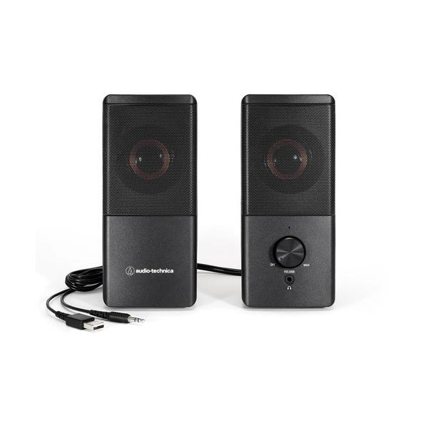 - オーディオテクニカ AT-SP95 アクティブスピーカー 発売日:2021年11月19日●ACアダプターが不要なUSB 給電タイプPCやオーディオ機器などのUSB ポートにUSB Type-Aプラグを、ヘッドホン端子にφ3.5mm ステレオミニプラグを接続すればセッティングが完了。音楽を聴きたいときに、すぐに使えるので便利です。また、有線接続のため、音が遅れて聴こえるような心配もありません。●ボーカルや音声が聴きやすい高感度φ52mmスピーカーユニット長時間でも聴き疲れしないクリアな音質を実現。ステレオサウンドのため、PC やポータブルプレーヤー自体で音を再生するよりも迫力のある立体感がお楽しみいただけます。●省電力ながら高出力、ナチュラルなサウンドを再生2W+2W の出力ながら、高感度スピーカーユニットにより省電力でもナチュラルなサウンドを再生します。●ヘッドホン端子を前面に搭載し、PCやオーディオ機器接続時のプラグの差し換えが不要本スピーカーをPCやオーディオ機器のヘッドホン端子に接続している際に便利です。スピーカー前面のヘッドホン端子にお持ちのヘッドホン(別売)をつないで楽しめるだけでなく、ヘッドホン接続時の音量もスピーカー側で調整可能です。また、アナログ出力のあるターンテーブルを接続して、手軽にレコードの音も聴くこともできます。●電源ボリューム/ノブを回すだけのかんたん操作スピーカー前面にある電源ボリューム/ノブを設置。使用する際に迷うことなく操作できるよう、電源とボリュームを一体化しました。ノブ回すだけで電源が入り、音量調整を行なうことができます。●場所を取らない省スペース設計パーソナルスペースや、PC のデスクトップ周りで使用されることを想定したデザインを採用。主張しすぎないシックな配色とコンパクトなボディで空間に溶け込みます。●デュアルモニターまでカバーする渡りコードPCやオーディオ機器とつながるオーディオ/USB コードの長さは取り回しやすい1.2m。また、左右のスピーカーをつなぐ渡りコードはデュアルモニターでも使える1.5mの長さで設計しています。【仕様】型式:アンプ内蔵スピーカーシステムスピーカーユニット:φ52mm( フルレンジ)出力音圧レベル:82dB/mW再生周波数帯域:100 〜 20、000Hz最大出力:4.0W入力インピーダンス:20kΩ入力端子:φ3.5mm ステレオミニプラグヘッドホン出力端子:φ3.5mm ステレオミニジャック左右接続コード長:1.5m入力コード長:1.2mUSB 電源コード長:1.2m