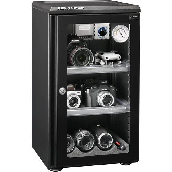 - 耐久性抜群の日本製電子ドライユニット搭載、光触媒と可視光LEDで庫内をクリーンに保持しつつ電気代1日1円以下の省エネ設計! 1ドア 引出棚 2段 高さ調整 外部コンセント 鍵付 アナログ湿度計 乾燥材交換不要 梅雨 湿気
