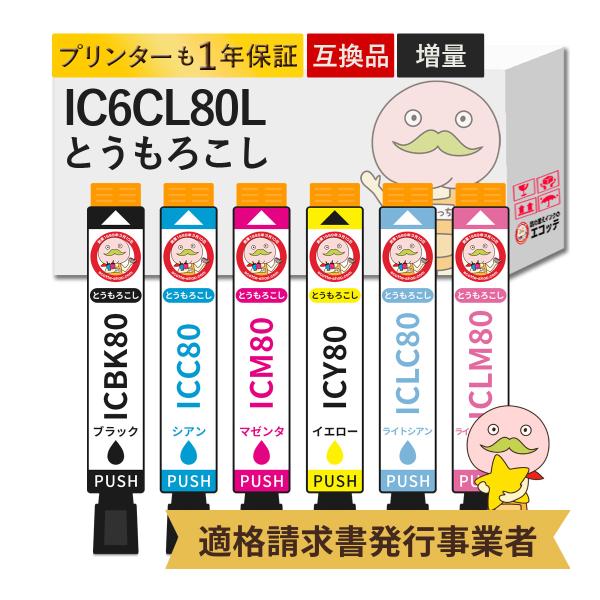 IC6CL80L とうもろこし EPSON エプソン 用 プリンターインク 互換 大容量 増量 6色 IC80 EP-708A EP-707A EP-978A3 EP-977A3 EP-808AR ic80 IC80L プリンター イ
