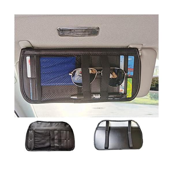 - 【便利で遊び心のあるアイテムが、すべての移動時間を楽しくします。】 大型バイザーにも取付けできるバイザーポケット。スマートフォンやサングラス、カード、ケーブル等のドライブグッズを収納できます。 【高級感ある本革&PP板】メイン素材に本革調の生地を使用しております。裏側にはBODYをしっかり固めるPP板が設計されております。高級感のある車内を演出します。 【取り付け簡単&通用サイズ】 取り付けは裏面のマジックテープで調整出来ます。通用サイズ:32×20cm(実寸はメジャー採寸の為、若干の誤差が生じる場合があります) 【多機能の収納スペース】 カードポケットには駐車券やETCカード等を6枚、メッシュポケットには携帯電話、駐車券や領収書を収納できます。そのほかに、ボールペンも収納出来ます。 【サングラス留めるのに便利なゴムベルト】 サングラスを収納したいときにも便利なゴムベルト付きで、置く場所に困りがちなアイテムをすっきり収納してくれます。