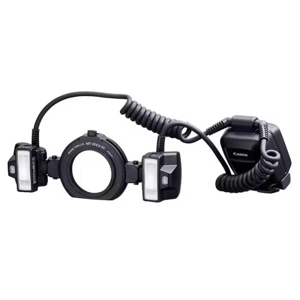 - キヤノン MT-26EX-RT(W) マクロツインライト発売日:2021年10月22日●可動式の発光部2灯を備えた、マクロ(近接)撮影に最適な外部ストロボマクロツインライト「MT-26EX-RT(W)」はマクロ撮影用外部ストロボ※1※2です。最大ガイドナンバー※3約26.0(両側発光時)を実現した可動式の発光部を2灯備えており、撮影者の意図に沿った柔軟なライティングができるため、草花や昆虫、料理などの被写体を大きく写す際に、自然な陰影や立体感などを表現することができます。※1:対応レンズは EFレンズシリーズのマクロレンズです。※2:「MT-26EX-RT」は、電波通信により、マスターカメラのレリーズに連動してスレーブカメラを自動的にレリーズさせる連動撮影を行うことはできません。※3:発光量を示す値。ガイドナンバーの数値が大きいほど、より遠くの被写体を撮影可能。●撮影者の意図に沿った柔軟なライティングを実現する優れた基本性能E-TTL II / E-TTL自動調光※4に対応するとともに、両側発光、片側発光だけでなく、2灯の発光量をそれぞれ調整可能な「光量比制御」機能を備えています。発光部は使用するレンズや被写体との距離に応じて位置や角度を細かく調整できるため、撮影者の意図に沿った柔軟なライティングが可能です。また、マニュアル発光時に、最小1 / 512まで発光量の調整範囲が広がったことにより、マクロ撮影時に起こりがちな「白とび」を抑えることができます。※4:E-TTL自動調光は、ストロボが本発光する直前にプリ発光を行い、被写体に必要な発光量を計算するシステム。E-TTL II自動調光は、さらにレンズからの距離情報を加味して、より高精度で安定した調光を実現するシステム。●電波通信ワイヤレス増灯(多灯)撮影に対応従来の光通信方式に加え、新たに電波通信方式のワイヤレスマスター機能を備えています。電波通信でワイヤレス増灯撮影を行う際は、スレーブ機能を備えた外部ストロボ「スピードライトEXシリーズ」を最大5グループ※5、最大15台まで制御できます。また、電波通信の特長を生かし、カメラとストロボの間に障害物が多い場所でも配置できるため、撮影の自由度が向上しています。※5:「グループ発光モード」設定時。【仕様】・ガイドナンバー:両側発光時:26.0(ISO100・m)、片側発光時:19.9(ISO100・m)・照射角:上下約65°、左右約65°(発光部基準位置/片側)・露出制御方式:E-TTL II/E-TTL自動調光、マニュアル発光・発光形態:両側発光/片側発光・光量比制御:8:1〜1:1〜1:8、1/2段ステップ・ハイスピードシンクロ:可能(電波通信ワイヤレス増灯撮影時は、2012年以降に発売されたEOSデジタルカメラ(EOS Kiss X80/X70を除く)使用時のみ可能)・マニュアル発光:1/1〜1/512発光(1/3段ステップ)、電波通信または光通信ワイヤレス増灯撮影時は1/1〜1/128発光、ハイスピードシンクロ撮影時は1/1〜1/64発光・発光間隔(充電時間):通常発光:約0.1〜5.5秒、クイック発光:約0.1〜3.3秒 ※単3形アルカリ乾電池使用時・通信チャンネル:オート、Ch.1〜15・スレーブ制御:最大5グループ(A B C D E)、最大15台・通信可能範囲:約10m ※マスター〜スレーブ間に障害物、遮蔽物がなく、他の機器との電波干渉がない場合 ※配置条件や周囲の環境、気象条件などにより、通信可能距離が短くなることがある ※MT-26EX-RTは、電波通信による連動撮影を行うことはできません・通信チャンネル:Ch.1〜4・スレーブ制御:最大3グループ(A B C)・通信可能範囲:屋内:約0.2〜10m、屋外:約0.2〜6m(正面時)・カスタム機能:8種・パーソナル機能:5種・本体電源:単3形アルカリ乾電池 4本(単3形ニッケル水素電池使用可能)・発光回数:約100〜700回 *単3形アルカリ乾電池使用時・外部電源:コンパクトバッテリーパックCP-E4N使用可能・大きさ:発光部:約62.3(幅)× 55.8(高さ)×49.1(奥行)mm 制御部:約69.5(幅)× 112.5(高さ)×90.0(奥行)mm 取り付けリング:約136.6(幅)× 91.1(高さ)×29.9(奥行)mm・重量:約570g(ストロボ本体のみ、電池別)対応レンズEF50mm F2.5コンパクトマクロEF100mm F2.8マクロEF100mm F2.8マクロ USMEF100mm F2.8Lマクロ IS USM(装着時にマクロライトアダプター67(別売り)が必要)EF180mm F3.5Lマクロ USM(装着時にマクロライトアダプター72C(別売り)が必要)EF-S35mm F2.8マクロ IS STMEF-S60mm F2.8マクロ USMMP-E65mm F2.8 1-5×マクロフォト※EF-M28mm F3.5マクロ IS STMには取り付け不可