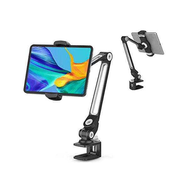- ZenCT IPAD スタンド ホルダー クリップ式 タブレットpcスタンド スマートフォン/iPhone/iPadスタンド<店内2点以上お買上げでさらに200円引クーポン進呈> ZenCT IPAD スタンド ホルダー クリップ式 タブレットpcスタンド スマートフォン/iPhone/iPadスタンド 送料無料 すべての4〜11インチのタブレット/スマホ/Nintendo Switchなどに対応できるの多機種ホルダー! 幅113〜190mm、厚さ13mmまでのタブレットに対応できます オフィス、寝室、キッチン、バスルームなどいろいろな場所に適用。動画、電子書籍などを楽しむことに最適です。 タブレットPCを取り付け部分は360度に自由回転することができます。縦向きでも横向きでも自分好みの角度に調整できます。タブレットをしっかりと固定できます。安定性抜群です。 台座はクランプ式なので簡単に設置可能です。クランプの板を挟む面には、ズレを防ぎ、天板へのキズを予防するシリコンシートが付いています 素材: アルミニウム合金+ゲル。アームは高級なアルミニウム合金製で、質感と剛性高くて耐久性もいいです。※ZenCTからご購入の場合、12カ月日本国内の安心保証付き、万が一初期不良が発生しましたら、お気軽にご連絡ください。 本店はお客様の満足のために力を尽くして頑張ります。 【テレワーク関連】