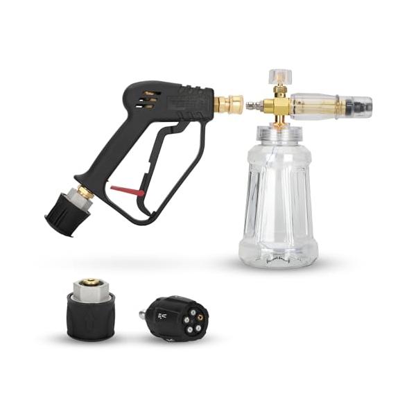 - 【真鍮&アルミ合金のアダプター採用】ankon真鍮 ショートガン ケルヒャー対応 高圧洗浄機ショートガン 洗車 ケルヒャーショートガン 高圧洗浄ショートガン ケルヒャーフォームガン ノズ【ankonケルヒャーショートガン】 ankonショートガンには1/4インチのクイックコネクトヘッドが含まれており、フォームガンと組み合わせて使用することで、泡洗車がより簡単になります。この製品は、Karcher Kシリーズの「クイックコネクトホース」に対応するショートガンです。Karcher K MINI K2 K3 K4 K5 K7 JTKと互換性があり、クイックコネクト接続は金属製で、凹凸があってもスクラッチを防止し、接続を妨げません。ショートガンのテールはM22-14mmめねじインターフェースを採用しており、M22-14mmめねじジョイントのホースに直接接続できます。クイックコネクト採用前の古い機種のホースには接続不可。OC3、KHB5、業務用HDシリーズは接続できません。【安全ロックで耐久性に優れる】 この高圧洗浄ショートガンには安全なトリガーロックが付いており、誤ってトリガーを引いたときの水の飛び跳ねを防止できます。また、高品質の黄銅で作られており、密封性が高く、最大4000PSIの圧力に耐えることができ、一般的なプラスチックよりも耐久性が高く、より徹底的にクリーニングできます。【1台5役のマルチスプレー】 ankonケルヒャーショートガンには、調整可能な1/4インチクイックコネクトノズルが1つ含まれています。5つのスプレーモードがあり、すべてのクリーニングニーズに対応できます。スプレーモードは0°、15°、25°、40°、および65°で、必要に応じて回転調整できます。(65°では水の流れがシャワーのようになり、高圧洗浄ではありません)。【スノーフォームランス】 洗車ガンは車、オートバイだけでなく、床、窓、私道、屋根などの洗浄に最適です。1Lの洗剤ボトル付属、よりキレイで楽に洗浄できる様に工夫しています。 【高性能素材&環境に優しい】フォームガンボトルのボトルヘッドは、アルミニウム製の硬化材料とステンレス鋼の組み合わせを採用しており、耐荷重能力が大幅に向上し、軽量化しています。アルミニウムは硬化処理によって耐腐食性能と安定性がさらに向上します。フォームランスボトルの本体は、透明度が高く、軽量で耐摩耗性と耐腐食性があるPETプラスチック材料を採用しており、ボトル内部の容量を明確に確認することができ、一定の外部衝撃にも耐えることができます。また、両方の材料はリサイクル可能であり、再加工によって資源消費と環境汚染を減らすことができます。【泡の量調節可能】フォームガンは、清掃のニーズに応じてスプレーノズルを調整し、必要な泡の状態にすることができます。上部のつまみは泡の吐出量を調節し、ノズルは泡の噴射角度を調整します。ノズルは360度調整可能です。【使用方法】 1.高圧洗浄ショートガンのクイックコネクタ(黒色)をショートガン本体に取り付け、もう一方の端をホースに接続します。 2.フォームランスボトルに約30%のカーシャンプーと70%の水を入れます(カーシャンプーの種類によっては、カーシャンプーの指示に従って混合比率を調整してください)。 3.吸管をボトルに差し込み、瓶の蓋を閉め、洗剤と水をよく振り混ぜます。 4.フォームランスボトルをケルヒャーショートガンに取り付けます。【メーカー】 ケルヒャーショートガン&フォームガンに欠陥がある場合は、迅速に対応いたします。何か問題がある場合は、いつでも【mendoyo】にお問い合わせください。24時間以内にお客様の問題に対応いたします。【使用上の注意】 他人に向けないでください。安全性を考慮し、以下の数値内でご使用ください。ショートガン最大圧力:4000psi(280Bar)、最高水温:150℃(300℉)、水流量:25tt/min(7USGal/min)。フォームガン最大圧力:2600psi(18MPa)、最高水温:60℃(140℉)。