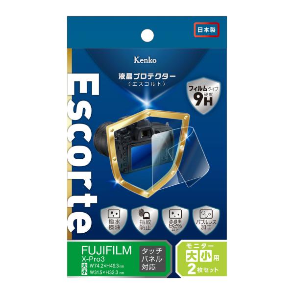 - 商品情報商品の説明商品紹介 デジタル一眼レフ、ミラーカメラなどに対応する、専用液晶保護フィルム「液晶プロテクター Escorte」です。 液晶保護ガラスと同等の表面硬度9Hを実現。細かい傷がつきづらいので、長期間使用していても視認性が下がりません。気泡消滅タイプのシリコンを採用。装着時に気泡残りが気にならず、きれいな仕上がりを実現しています。 貼りつけは、取っ手シールの採用で貼りやすさ抜群! きれいに貼れて、しっかり守れる。カメラを守る「盾」となる、高性能液晶保護フィルムです。 ■「フィルム」で表面硬度9Hを実現 ! 液晶保護フィルムでありながら、液晶保護ガラスと同等の表面硬度9Hを実現しました。擦り傷などの細かい傷がつきづらいので視認性の低下を防ぎます。 ■撥水・撥油コーティングでお手入れラクラク 水や油を弾く、撥水・撥油コーティングを施しているので、水しぶきや指紋などの汚れがついてしまっても、クリーニングクロスなどでさっと簡単にふき取ることが可能です。 ■画像鮮やか光沢仕様 全光線において透過率92.0%を実現した高光沢フィルムが優れた透明感を発揮。写真・動画をきれいに映し出します。 ■貼付け簡単「取っ手シール」 両端に持ち手があるので貼りやすい「取っ手シール」を採用。貼り付ける前にシート本体を汚すことなく簡単、きれいに貼りつけることができます。 ご注意(免責)>必ずお読みください ※に関するお問い合わせはカスタマーサポートにご連絡ください。 ケンコー・トキナーお客様相談室【固定回線】0120-775-818【携帯電話・IP電話】03-6840-3389 ※通話料金はお客様負担です。 もしくは下記のURLの「お問い合わせフォーム」よりお問い合わせください。www.kenko-tokina.co.jp/address.html主な仕様 ガラスと同等の表面硬度9Hを実現。カメラを守る「盾」となる、高硬度液晶保護フィルムハードな場面でもお手入れ楽々!撥水・撥油コーティング時間とともに気泡が消える、バブルレス加工貼付け簡単!取っ手シールを採用対応機種: X-Pro3