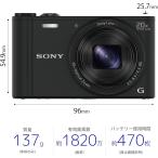 - 商品紹介 風景をワイドに写せる広角25mmから、遠くの被写体に迫れる望遠500mmまで幅広い撮影領域に対応。さらに、全画素超解像40倍ズーム撮影(*2)も可能です。ズーム撮影時に心配な手ブレは、先進の光学式手ブレ補正でしっかりと防止。また、高速オートフォーカスで、撮りたい瞬間を逃さず撮影できます。*1 2014年2月12日広報発表時点。光学20倍のズームレンズを搭載したコンパクトデジタルカメラにおいて。約164g(バッテリー NP-BX1、メモリースティック デュオ含む) *2 光学20倍ズームを含むワイド端からのズーム倍率 ※ 焦点距離は静止画撮影時(アスペクト比4:3)の35mmフィルム換算の数値です カメラがシーンを認識し、最適な設定を自動選択。夜景や逆光などの難しいシーンも、シャッターを切るだけで美しく撮影できます。暗いシーンもブレやノイズを抑えて明るく撮影できるほか、進化した画像処理エンジンBIONZ X(ビオンズ エックス)の搭載により、被写体ブレ低減が強化。動く被写体のブレを強力に抑えます。 NFC対応のスマートフォンやタブレット(*1)に、カメラをタッチするだけで接続可能。写真や動画(*2)を簡単に転送できるので、SNSなどでの共有がより手軽に行えます。さらに、Wi-Fi(R)機能により、多彩な機器と接続。たとえば、ネットワーク対応テレビなら、写真をワイヤレスで転送して快適に鑑賞できます。また、1回の充電で約470枚(*3)のスタミナを実現しています。 *1 スマートフォンやタブレットにPlayMemories Mobileがインストールされている必要があります。PlayMemories Mobileは「Google Play」または「App Store」から入手できます *2 静止画は、撮影時のオリジナルサイズ、または2Mにリサイズされた画質を転送できます。動画は、MP4モードの動画のみ対応。ファイルサイズによって転送時間が異なります *3 測定条件:液晶画面をON、ズームをW側T側それぞれ交互に端点まで移動を繰り返し、2回に1回フラッシュ発光、10回に1回電源をON/OFFして、30秒ごとに1回撮影