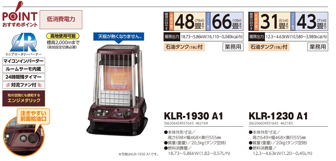 - 長府製作所(サンポット) 開放タイプ暖房機 KLR-1230A1【仕様】●ファン付(天板が熱くなりません)●電源(V):単相100●暖房出力(kW):4.63~12.3●タンク容量(L):18●本体寸法(mm)幅:468●本体寸法(mm)奥行:555●本体寸法(mm)高さ:649●運転音(dB):47●色:エンジメタリック●暖房目安コンクリート:43畳●暖房目安木造:31畳●燃料消費量(L/h):0.45~1.20●燃焼持続時間(h):15.0~40●暖房出力(kW/h):4.63~12.3●燃料消費量(L/h)0.45~1.2●消費消費(50/60HZ)(W):37/39●質量:20kg【特長】●運転スイッチを押すと、約100秒で着火します。●リニアロータリーバーナーのため、省電力で経済的です。●室温を自動調整するルームサーモ機能が、本体に内蔵されています。長府製作所(サンポット)