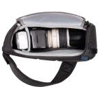 ショルダーストラップを付け替えて、左右どちらの肩でもバッグを背負えます。取り外しできるウエストベルトを使えば、より安定した装着も可能です。両側面のジッパーポケットにバッテリーや SD カードなどのアクセサリーを入れたり、前面のポケットに帽子やグローブなどの小物を収納できたりと、小ぶりながら収納力も備えています。また、付属の三脚用ストラップでバッグ前面に小型三脚を取り付けられます。