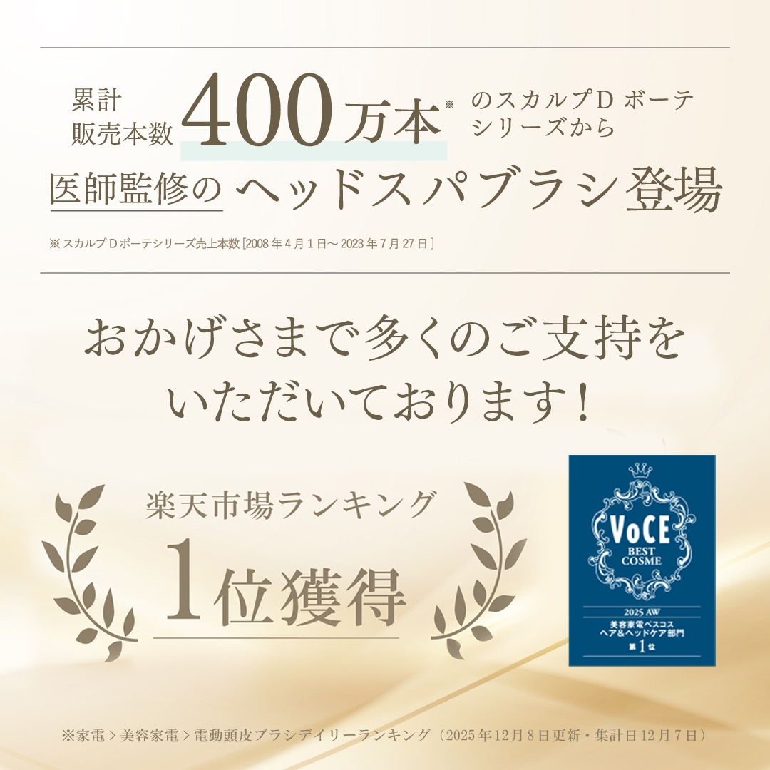 - ◆楽天デイリーランキング電動頭皮ブラシ部門第1位◆ カテゴリ:家電 > 美容・健康家電 > 電動頭皮ブラシ (更新日:2025年12月8日/集計日:2025年12月7日) 【商品名】 スカルプD ボーテ ビューティーヘッドスパ ■通常品:ビューティーヘッドスパ ■ラッピング袋付き:ビューティーヘッドスパ+ラッピング袋 ■入浴剤+ラッピング袋付き:ビューティーヘッドスパ+ラッピング袋+入浴剤 製品仕様など、詳しい商品情報はこちら ≫ 【商品説明】 ■スカルプD ボーテ ビューティーヘッドスパ エイジングケアクリニック医師監修によるヘッドスパブラシ スパ体験しているかのようなリラックス感を味わいながら、「やわらぎケア」、「温熱ケア」、「頭髪洗浄ケア」の3つのケアで、本来の弾むような髪と顔つきを呼び覚ます。 【頭皮ケアを極める6つの特徴】 【1】頭皮をググっと引き上げる※2極上スパ体験 4つのヘッドで合計28カ所の接触点から生まれる繊細な動きに宿る確かなパワーを体感。 固い頭皮も「つまむ」ように「揉み動かす」ことで手もみしているような贅沢な体験を。 さらに3Dフィット設計で頭にあてるだけでしっかりフィット。筋膜ケア※3で顔のもたつき感もスッキリとした印象に。 ※2 ヘッドの回転刺激による効果 ※3ヘッドの回転刺激による効果 【2】スッキリ頭髪洗浄 人間工学に基づいたブラシで手洗いでは落ちきらない汚れを一掃。 お風呂上りのスッキリ感、髪のふんわり感を速攻体感。 美しい髪は、美しい頭皮から。 【3】赤外線搭載、じんわり温熱ケア 赤外線の温熱が深部※2へ働きかける。 熱エネルギーで体内活動を活発化し、年齢とともにハリ不足を感じやすくなった肌や髪のハリ感をサポート。 こわばった頭皮へリフトケア※3 ※2 角質層まで ※3 機器を引き上げるように動かすこと 【4】選べる力強さとアタッチメントであなた好みの心地よさとフィット感を その日の気分や頭皮の状態に合わせて選べる機能。 揉み上げる強さは3段階からアタッチメントは硬さ違いに2種類から その日の気分や自分の好み使用部位に合わせて選べます。 【5】防水仕様 国際規格のIPX7防水仕様で浴室内で使用可能。ワンランク上の優雅なバスタイムを。 ※完全防水ではないので水中に沈めたり流水をあて続けないでください 【6】超軽量 わずか約172g。トップクラスの軽さとスリムさで疲れた日はもちろん、ストレスフリーに毎日続けられる快適さ。 【関連キーワード】 ================================== 赤外線 筋膜 頭筋 表情筋 顔 フェイス 首 肩 頭皮 ヘッドスパ デバイス フェイスケア シャンプーブラシ 頭皮洗浄 凝り かたい 硬い 固い 筋膜リリース クレンジング 頭皮クレンジング 頭皮ケア スカルプケア 洗髪 髪 頭皮 地肌 頭髪 ヘアケア 温熱 赤外線 洗髪 頭皮臭い 家電 美容家電 美容器具 電動 グッズ 自宅 家庭 ホームケア 防水 IPX7 自動 皮脂 皮脂よごれ 汚れ 頭皮エステ 癒し 軽量 コンパクト 軽い 小さい 美容機器 美顔器 リラクゼーション スッキリ リフト リフトアップ リフトケア スカルプ 男女兼用 プレゼント ギフト 贈り物 贈りもの お返し クリスマス 誕生日 母の日 父の日 敬老の日 ブラックフライデー バレンタイン ホワイトデー 女性 男性 日用品 メンズ レディース 肩 首 初売り 人気 売れ筋 おすすめ オススメ ランキング ================================== [広告文責] 製造・販売:アンファー株式会社 問い合わせダイヤル:0120-059-595 (受付時間9:00〜18:00 ※日曜・祝日・年末年始の休業を除く) 商品区分:【家電】TOPページ > 女性用ヘアケア