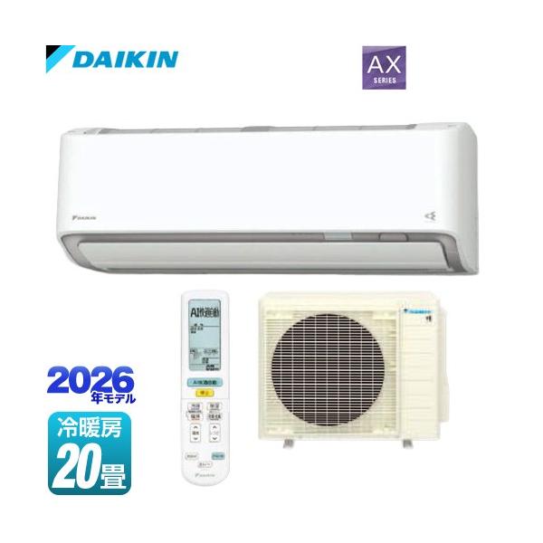 - ■ ダイキン(DAIKIN) ■【2026年モデル】ダイキン ルームエアコン AXシリーズさらら除湿、快適気流、節電自動運転など便利機能が充実のハイグレードモデル。◆ 主な特長 ◆■暮らしに役立つ省エネ・節電技術を搭載。・目標年度2027年省エネ基準を達成・プレミアムPIT制御 小さな能力が出せるので、室温がさらに安定します。・エコブースト制御 学習効果で、高効率でムダなく立ち上げます。・節電自動運転(温度・しつどコントロール) 室内が設定温度・しつどに到達し安定すると、消費電力を抑えて運転します。■さらっと涼しい、夏の快適冷房。・プレミアム冷房 設定温度になったあとも蒸し暑さを感じにくい快適冷房をお届けします。・さらら除湿 季節やシーンに合わせて、かしこく除湿コントロールします。・猛暑時スピード気流 猛暑の時は、お部屋の中央へより涼しく冷房気流を集中させます。■冬の乾燥に、プレミアム暖房。・垂直気流 壁から足元へ、ぬくもりが伝わるあたたかい気流をお届けします。■エアコンもお部屋の空気もクリーン。・水内部クリーン(結露水洗浄) 結露水で汚れを洗浄し、送風乾燥でエアコン内部をキレイに。■AI 快適自動運転AI が好みの運転を記憶学習。快適な自動運転を行います。■高効率スイングコンプレッサーダイキン独自の高効率・高耐久設計■タフネス暖房・冷房寒い冬も暑い夏もタフに動いて快適■スマホやスマートスピーカーから、操作できる※専用アプリならびにお使いの無線LANインターネット接続環境、ダイキン会員サイトのユーザー登録が必要です。◆ 主な仕様 ◆畳数の目安:おもに20畳 ・暖房:16〜20畳 (26〜32平方メートル) ・冷房:17〜26畳 (29〜43平方メートル)暖房能力:7.1kW (最小値0.4kW〜最大値12.2kW)外気温2℃時の暖房能力:9.1kW冷房能力:6.3kW (最小値0.3kW〜最大値6.5kW)消費電力… ・暖房時:1550W (最小値75W〜最大値3730W) ・冷房時:1750W (最小値80W〜最大値1820W)電源:単相200V 20A / コンセント形状:エルバー型外形寸法… ・室内機:幅798×高さ295×奥行370mm ・室外機:幅850(+配管カバー部89)×高さ679×奥行320(+脚部66)mm質量… ・室内機:16.5kg ・室外機:45kg最大配管長:20m(チャージレス15m)配管最大高低差:16m使用配管:2分4分配管簡易商品仕様シリーズ名:AXシリーズブランド名:ダイキン|DAIKINメーカー型番:S636ATAP-W代表カラー:ホワイトAPF(通年エネルギー消費効率):6.2エアコンのタイプ:壁掛け暖房の最大適用畳数(鉄筋):20畳暖房の最大適用畳数(木造):16畳冷房の最大適用畳数(鉄筋):26畳冷房の最大適用畳数(木造):17畳AI自動運転:有冷房能力:6.3kW年間電気代:51900円省エネ性マーク(緑):省エネ性マーク(緑)カラー:ホワイトフィルター自動お掃除:有人感センサー:有ブランド名(カナ):ダイキン省エネ目標年度:2027空気清浄:有