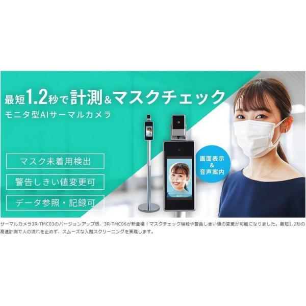 - サーマルカメラ3R-TMC03のバージョンアップ版、3R-TMC06が新登場! マスクチェック機能や警告しきい値の変更が可能になりました。 最短1.2秒の高速計測で人の流れを止めず、スムーズな入館スクリーニングを実現します。 ●マスク未着用者に画面表示と音声でマスク着用を促します 体表面温度を計測すると同時に、来訪者がマスクを装着しているか検知することができます。マスク未着用者に対して、マスクの装着を促す画面表示と音声アナウンスが流れます。 ●高速約1.2秒で結果を音声でお知らせ入館の流れを止めず密を防ぎます 体表面温度の計測時間は最短約1.2秒。モニタに結果を表示し、音声でお知らせします。高速で計測するため人の流れを止めず、密を防ぎます。 ●37.0度〜43.0度の間でしきい値の変更が可能になりました 「サーマルカメラ 3R-TMC03」では警告しきい値を37.5度から変更することはできませんでした。 この「サーマルカメラ 3R-TMC06」なら37.0度〜43.0度の間で変更することができます。 ※設定値を変更するにはPCとの接続が必要です 製品仕様 製品名:サーマルカメラ 型番 / JANコード:3R-TMC06 / 4589557954081 電圧:AC100V/240V 使用環境温度:16℃-35℃ ※使用環境温度外では正確に体表温を計測できません。 体表温度検出時間:1.2秒?2秒 OS:LINUX モニタサイズ:7インチ高解像度モニタ カメラ部解像度:1920×1080(200万画素) 顔識別速度:0.2秒 検知距離:50cm-70cm(推奨50cm) 警報しきい値:37.0〜43.0℃で変更可能 ※設定値を変更するにはPCとの接続が必要です。 消費電力:3.5W(5V0.7A) 測定体表温度範囲:35.1℃〜43.0℃ 測定精度:±0.3℃ 寸法(約):本体:340×115×105mm 土台:直径315mm 重量(約):本体:1190g 全体:8200g 高さ調整範囲:105cm〜155cm マスク検知機能:有り アラーム出力:2系統(NO、NC選択可能) 写真保存枚数:約8万枚 ※写真の閲覧および保存を行うにはPCとの接続が必要です。