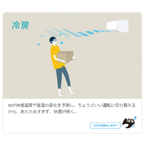 - ■ 三菱電機 ■「ZDシリーズ」【2024年モデル】キモチを見つめて空気を整える。清潔機能も充実した暖房強化プレミアムモデル。◆ 主な特長 ◆●ズバ暖霧ヶ峰赤外線センサーで足元を見つけてズバ抜けたあたたかさですばやくしっかりあたためる。寒い地域のユーザー様にご満足いただける暖房能力。●厳しい冬も快適にあたためる「暖房」快適ノンストップ暖房で、霜取り中もあたたかさが途切れない※1※2。※1:使用環境・住宅構造などにより効果が得られない場合があります。※2:状況により、暖房を停止して通常の霜取りを行う場合があります。最高約60℃の温風吹出しで、足元がぽかぽかに(「ハイパワー」運転時)。●快適はエアコンのセンサーにおまかせ「センサー機能」赤外線センサーでお部屋や人の温度を測り、独自のバイタルセンサーで気持ちまで測って快適に。AIが体感温度や室温の変化を予測し、ちょうどいい運転に切り替えるから、あたためすぎず、快適が続く。その人の温度の感じ方を見極めて、暑がりさんには風あて、寒がりさんには風よけで同時に快適。●エアコンでお部屋の空気をキレイに「清潔機能」電気を帯びたナノレベルの水のミストが、有害物質の活動を抑制し、さらに脱臭も。お部屋の空気をキレイに。設定した窓に向かって風を送った後、お部屋の隅によどみが残らないように空気をかき混ぜて、換気をアシスト。●自動でお掃除、さらに自分でもお手入れかんたん「お掃除機能」おそうじメカが自動で汚れをかきとり、エアフィルターを清潔に保つ。空気の通り道に汚れに強い特殊仕様を採用しているから、汚れにくくてお掃除らくらく。エアコンのフラップを開いて奥までお掃除できる。さらに、おそうじメカも取り外せてお手入れらくらく。●酷暑でも止まらない運転と寒くなりにくい除湿で快適に「冷房・除湿」冷たい風とあたたかい風を混ぜて、ちょうどいい温度の風にするから、肌寒さを抑えて除湿できる。屋外温度が50℃(室外機の吸込み温度)になっても冷房運転が止まらない。●毎日のくらしをみまもり、便利に「便利機能」エアコン停止中にお部屋が暑くなると自動で冷房運転を開始。高齢の方やお子様のいるお部屋におすすめ。●霧ヶ峰REMOTEアプリで便利自宅に近づくとエアコンを自動でONして、帰ったときには快適。離れると自動でOFFして、消し忘れも防いでくれる。お留守番中の家族や離れて暮らす家族の快適を、サーモ画像でみまもれる。◆ 主な仕様 ◆■畳数の目安:おもに14畳・暖房:13〜17畳 (22〜27平方メートル)・冷房:11〜17畳 (18〜28平方メートル)■暖房能力:6.0kW (最小値0.9kW〜最大値12.1kW)■外気温2℃時の暖房能力:9.2kW■外気温-15℃時の暖房能力:7.5kW■冷房能力:4.0kW (最小値0.9kW〜最大値5.4kW)■消費電力:・暖房時:1430W (最小値135W〜最大値3960W)・冷房時:960W (最小値135W〜最大値1580W)■電源:単相200V 20A / コンセント形状:エルバー型■外形寸法:・室内機:幅799×高さ295×奥行389mm(据付後394)・室外機:幅800(+配管カバー部62)×高さ714×奥行285(+脚部60)mm■質量:・室内機:19.0kg・室外機:41.0kg■最大配管長:20m■配管最大高低差:15m簡易商品仕様シリーズ名:霧ヶ峰(三菱電機)ブランド名:三菱電機|三菱メーカー型番:MSZ-ZD4024S-W代表カラー:ホワイトAPF(通年エネルギー消費効率):6.2エアコンのタイプ:壁掛け暖房の最大適用畳数(鉄筋):17畳暖房の最大適用畳数(木造):13畳台数:1冷房の最大適用畳数(鉄筋):17畳冷房の最大適用畳数(木造):11畳AI自動運転:有冷房能力:4.0kW年間電気代:32940円省エネ性マーク(緑):省エネ性マーク(緑)カラー:ピュアホワイトフィルター自動お掃除:有寒冷地対応:有人感センサー:有ブランド名(カナ):ミツビシデンキシリーズ名(カナ):キリガミネ省エネ目標年度:2027