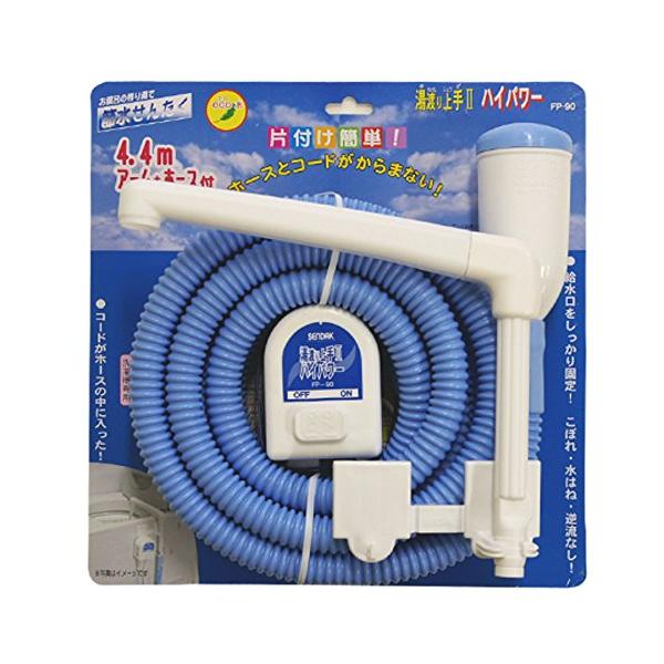 - [センタック 洗濯機専用のお風呂ポンプセット 湯渡り上手II ハイパワー FP-90 [FP90]] の商品説明●ハイパワーで時間短縮&エコロジー。●毎分9.5リットルの吐出量という、揚程(※)1mのときには40リットルの洗濯機に約4分で残り湯を汲み上げられるハイパワー。短時間で作業できるのがうれしい節水洗濯ホース。 (※)ポンプが水をあげる高さ。●ポンプ内蔵のホースですっきり収納。絡まりやすかった従来品から改良されました。●ポンプのコードがホースの内側に入っているので、すっきり収納できる。フィルターレスなので片づけも楽々。●簡単装着で、買ってすぐに使える。ポンプ・電源器・ホースと、必要なものがすべてセットになっているので、買ってすぐに使える。●吸水口(アーム)が回転するので、装着したまま洗濯機のふたを閉めることができ、すぐに洗濯を始められる。●アームは固定式なのでホースを押さえていなくても水が飛び散らない。●水が逆流しない安心設計。[センタック 洗濯機専用のお風呂ポンプセット 湯渡り上手II ハイパワー FP-90 [FP90]]のスペック●吐出量:毎分11リットル/揚程0m、9.5リットル/揚程1m●最大揚程:3●電源コード長:1m●ポンプコード長:4m ※台紙には4.4mアーム+ホース付で表記●付属品:アーム、ベース○初期不良のみ返品可
