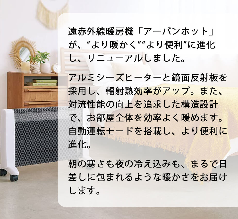 - 名称:遠赤外線暖房機 アーバンホット 商品コード:RH-3000 JANコード:4906601005023 サイズ:幅650×高さ430×奥行240 mm 重量:約6.3kg 定格消費電力:1000W 材質 : ・本体:PC樹脂+ABS樹脂 ・前面パネル:鋼板(ナイロン植毛) ・背面パネル:鋼板 ・スタンド:ABS樹脂 タイマー: ・入/3~9時間(1時間単位) ・切/1~4時間(1時間単位) 動作モード: ・強:1000W ・中:750W ・弱:500W ・自動:室温センサで強/弱を調整 安全装置 ・転倒時OFFスイッチ: ・温度過昇防止装置 (サーモスタット・温度ヒューズ) ・電流ヒューズ ・基板温度過昇検出(サーミスタ) ・切り忘れ防止タイマー(8時間) 電源コードの長さ:約2.5m 暖房の目安:4.5畳~7畳 生産国:日本遠赤外線の効果で身体をやさしく暖めるヒーター。輻射効果でひだまりのような暖かさが得られます。 W暖房方式で人とお部屋全体を効率的にやさしく暖めます。 コンパクト設計ながら出力はパワフル。リビング、寝室、個室など様々な場所で活躍します。風がでないヒーターのため、ホコリや菌を巻き上げません。また温風による乾燥から喉や肌を守ります。前面はフロッキー(植毛)加工を施しており、やけどの心配が少なく小さなお子様にも安心です。転倒時安全装置・温度過昇防止装置を採用しており、常に安心してご使用になれます。 切タイマー/入タイマーを搭載。例えば就寝時/起床時に合わて設定するなどに便利です。 信頼の日本製です。 【アーバンホット RH-3000】 遠赤外線暖房機「アーバンホット」が、“より暖かく”“より便利”にリニューアル アルミシーズヒーターと鏡面反射板を採用し、輻射熱効率がアップ。 また、対流性能の向上を追求した構造設計で、お部屋全体を効率よく暖めます。 自動運転モードを搭載し、より便利に進化。 朝の寒さも夜の冷え込みも、まるで日差しに包まれるような暖かさをお届けします。 【前モデル(RH-2201)からの改良点】 ●ヒーターの反射板に鏡面アルミを採用。 RH-2201より効果的に輻射熱を前面に放射することができ、より温かみを感じられるようになっております。 ●強弱に加え、750W出力の『中モード』を追加。 より細やかな温度設定が可能になりました。 ●『自動モード』を追加し自動で適正室温に調整します。 それに伴う電気代節約が可能です。 ●熱伝導率のよいアルミシーズヒーターを採用。 RH-2201より速暖設計です。 ●消音モードを搭載、操作音が気になる方やお子様が寝静まる夜に安心です。 ●ホコリがたまりにくい底面形状になり、メンテナンス性が格段に向上しました。 ●本体重さ約1.5kg減。 キャスターも従来通り搭載しており、移動がよりスムーズになりました。 商品詳細 名称遠赤外線暖房機 アーバンホット 商品コードRH-3000 JANコード4906601005023 サイズ幅650×高さ430×奥行240 mm 重量約6.3kg 定格消費電力1000W 材質・本体:PC樹脂+ABS樹脂 ・前面パネル:鋼板(ナイロン植毛) ・背面パネル:鋼板 ・スタンド:ABS樹脂 タイマー・入/3〜9時間(1時間単位) ・切/1〜4時間(1時間単位) 動作モード・強:1000W ・中:750W ・弱:500W ・自動:室温センサで強/弱を調整 安全装置・転倒時OFFスイッチ ・温度過昇防止装置 (サーモスタット・温度ヒューズ) ・電流ヒューズ ・基板温度過昇検出(サーミスタ) ・切り忘れ防止タイマー(8時間) 電源コードの長さ約2.5m 暖房の目安4.5畳〜7畳 生産国日本