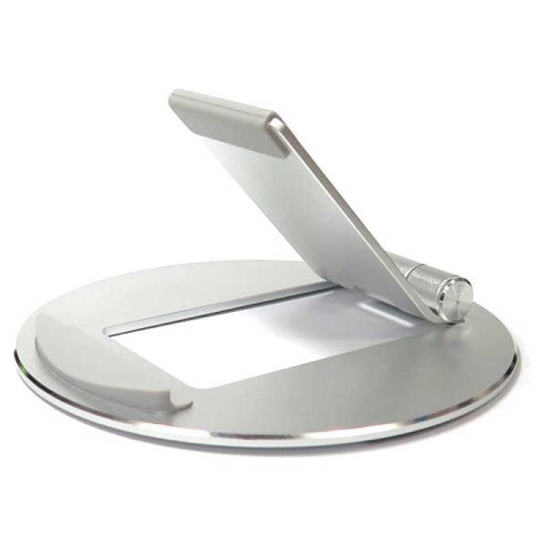 - スマートフォンやタブレット用の、シンプルなアルミニウム製スタンドです。縦置き&横置き対応はもちろん、スマホリングを搭載したままご利用いただけます。耐荷重は700gなので、iPadなどでもご利用いただけます。■縦置き&横置き縦置き&横置き対応。好きな角度で固定出来ます。■スマホリング搭載スマホも対応スマホリングをつけたままのスマホでもしっかり固定できます。■端末含む耐荷重約700g10インチまでのタブレットにも使用できます。■丸形のアルミ製丸形のアルミ製なので、カバンの中に入れても、他の機器を傷つけません。■製品仕様本体カラー:シルバー搭載可能端末:重さ500gまでのスマートフォンやタブレット耐荷重:700g(タッチ操作時の圧力を200gいないと想定)対応幅:6〜25cm(中央部に搭載した場合)サイズ:直径約14.6cm×高さ2〜11cm重量:約165g素材:アルミニウム筐体、端末保護/滑り止め用シリコンゴム製品保証:ご購入日より1年間※日本国内に限り、ご購入店名とご購入日が記載されたレシートや領収書、納品書の写しが必須です。