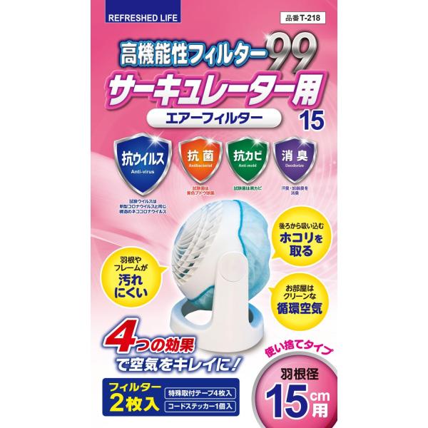 - 商品情報サイズ羽根径15用/フィルター 36.5φ/cm(φ直径)2枚入材質フィルター:ポリエステル・セルロース繊維 アクリル酸エステル樹脂ゴム:合成ゴムコードステッカー:鉄特殊取付テープ:ナイロン 成分銅化合物:ビグアナイト誘導体化合物原産国日本販売元株式会社日本デンソーご注意ご覧頂いている商品の写真につきましては、できるだけ実物の色に近くなるように努めておりますが、お使いの環境(モニター、ブラウザ等)の違いにより、色の見え方が実物と若干異なる場合がございます。予めご了承ください。【メール便 送料無料】 サーキュレーターフィルター サーキュレーター 羽根径15cm用 エアーフィルター 抗ウイルス 抗菌 抗カビ 消臭 高機能性フィルター99 2枚入 日本製 (株)日本デンソー T-218 抗ウイルス・抗菌・効カビ・消臭の高機能性フィルターはお部屋の空気をクリーンで爽やかに! フィルターに付着した「新型コロナウイルス」試験結果 静置時間2時間後99.96%の減少率 ・メール便は2個までとなります。・フィルター 36.5φ/cm・梱包サイズ 29×17.5×2.5cm 23g・羽根径15用・PC抗ウイルス・抗菌・効カビ・消臭の公的試験機関の効果評価試験のエビデンスを担保しています。・「ウイルス・雑菌・カビ」の繁殖を抑制し、安心で清潔なお部屋の空気をお届けします。「ホコリ」も防止してお掃除軽減!・ファン本体部が両側の支柱で支えられて、上下動作する形状の製品(H型タイプ)にご使用いただけます。・新型コロナウイルス試験は、フィルターに付着したウイルスの減少試験です。いずれも実使用環境での実証効果を表すものではありません。 7