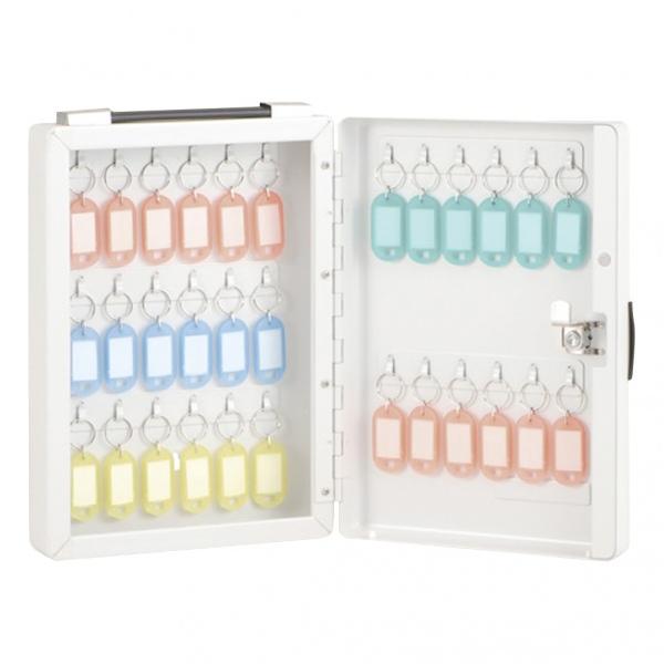 - 壁掛けや持ち運びもできる、シンプルなキーボックスです。品名キーボックス 30個収容品番NKB-E03本体寸法W200×D65×H284mm本体重量1.4Kg材質本体/スチール・ABS樹脂・PVC キーホルダー/ポリプロピレン施錠方式シリンダー錠収容数30個付属品キーホルダー30個(赤12個、青6個、黄6個、緑6個)、シリンダーキー2本、木ネジ3本(約30mm)メーカー取寄品