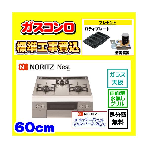N3WU5PWAP2STE ★今ならロティプレート・感震器プレゼント 工事費込み 既存品処分費無料 ノーリツ ガスコンロ 工事費込 ネスト NEST 交換 取付 設置