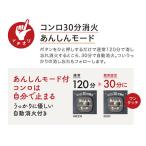 コンロ30分消火あんしんモード:ボタンをひと押しするだけで通常120分で消し忘れ消火するところ、30分で自動消火。ついうっかりの消し忘れもフォローします。