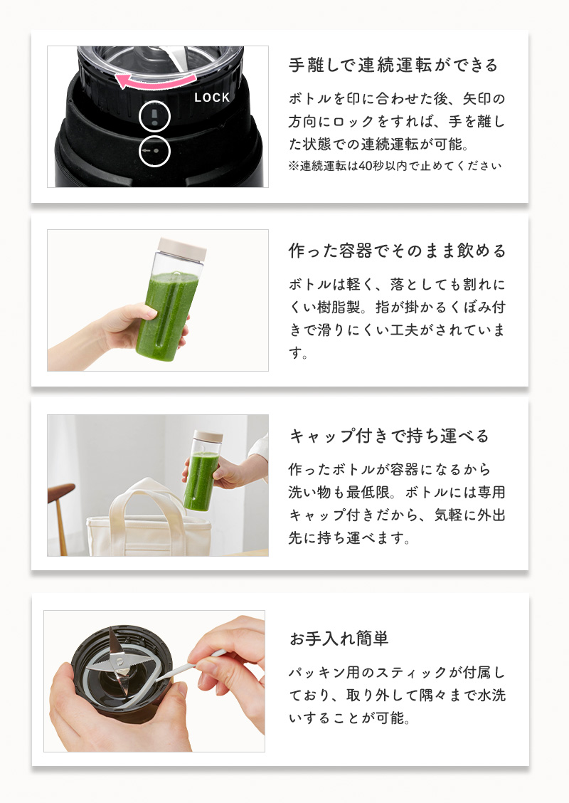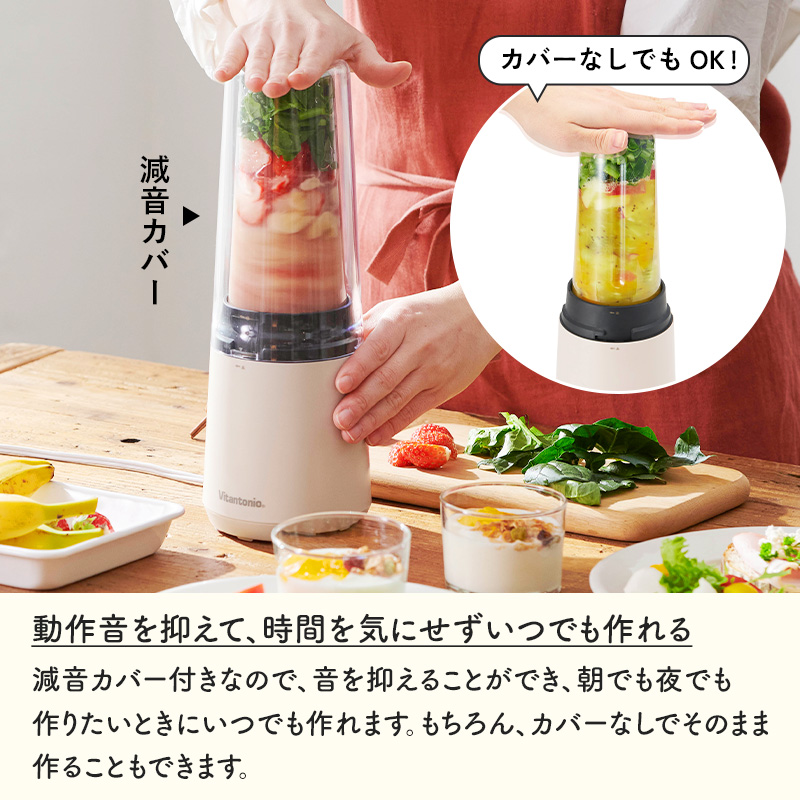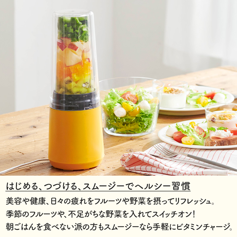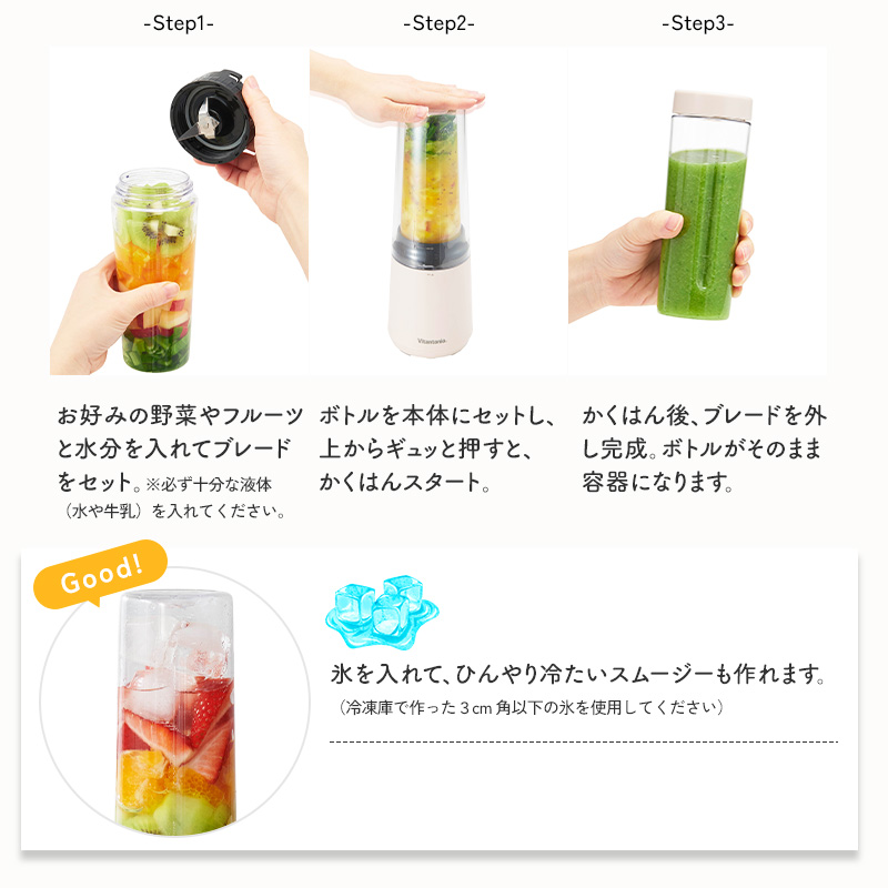 - 忙しい朝でも、手軽に美味しいスムージーが作れるマイボトルブレンダー。 野菜や旬のフルーツを入れてボタンを押すだけで、ビタミン満点のヘルシースムージーがあっという間に完成します。 容量たっぷり400mlのボトルがもう1本付属するボトル2個セット。 作った容器がそのまま飲めるボトルになるので、移し替え不要で洗い物も少なく済みます。 作りやすいから、続けやすい。ヘルシー習慣始めませんか。 この商品はラッピング可能です。(+110円)ご希望の方は[ラッピングする]を選択のうえ、ご注文ください。 ●沖縄・離島は追加送料がかかります。注文確認後、送料修正しご案内いたします。 JAN:4968291311945Vitantonio マイボトルブレンダーボトル2個セットVBL-60-I/Y マイボトルブレンダーではじめる、つづける、ヘルシー習慣 動作音を抑える減音カバー付き。さらに、容量たっぷり400mlのボトルがもう1本付属する「マイボトルブレンダー ボトル2個セット」。 野菜や旬のフルーツを入れてボタンを押すだけで、ビタミン満点のヘルシースムージーがあっという間に完成します。忙しい朝でも、手軽に美味しい一杯を楽しめます。出来上がりはたっぷり400mlサイズ。家族やシェア用にまとめて作れるほか、キャップを付ければ持ち歩きもOK。作った容器がそのまま飲めるボトルになるので、移し替え不要で洗い物も少なく済みます。冷蔵庫保存も可能です。 コンパクトなデザインだからキッチンに置きっぱなしでも邪魔にならず、収納もラクラク。大きなミキサーを出すのは面倒…という人でも、このブレンダーなら毎日のスムージー作りを気軽に楽しめます。 ヘルシーで美味しいスムージーが、たった3stepでできちゃうボトルブレンダー。 難しい操作は一切なく、忙しい朝でもフルーツやミルクを入れて押すだけ。バナナやベリー、キウイなど好きなフルーツを組み合わせれば、栄養も彩りもたっぷりの一杯が完成します。 スムージーのレシピはネット検索で無限に広がり、驚くような新しい組み合わせに出会えるから飽きずに続けられるのも嬉しいポイント。サラダや食事から摂るのが難しい野菜も、フルーツと一緒にブレンドすれば美味しく、簡単に補えます。 減音カバーを使えば、撹拌音を約71dBまで低減。朝も夜も、時間を気にせずスムージー作りが楽しめます。 容量たっぷり400mlのボトルがもう1本付属。ふたりでシェアするのはもちろん、スープなどの一品料理をまとめて作って冷蔵庫にストックしておくこともできます。 VitantonioMY BOTTLE BLENDER SERIES ミニボトルブレンダーVBL-7 コードレスマイボトルブレンダーVBL-2000 マイボトルブレンダーVBL-70 <選択中>マイボトルブレンダー2個セットVBL-60 マイボトルブレンダーミル付きVBL-90 【ご注意】マイボトルブレンダーVBL-70とマイボトルブレンダーVBL-60(VBL-90)は異なる商品です。 今度は何作る?楽しいキッチン家電 Vitantonio 発酵メーカー GLUMP. 超少煙グリル TOFFY HAPPY COLLECTIONエアフライヤーミニ ⇒ 商品カテゴリー>キッチン家電 ⇒ 刻む・混ぜるがスピーディに!4ブレードミニチョッパー ●商品の詳細● 品 名 Vitantonio ビタントニオ マイボトルブレンダー ボトル2個セット VBL-70-I VBL-70-Y サイズ 本体:約 幅110 × 奥行110 × 高さ300mm(コード長:1.0m(有効長)) ボトル:約 直径78 × 高さ182mm 容 量 約 400ml 材 質 ボトル:AS樹脂、本体、フタ:ABS樹脂、減音カバー:ポリカーボネート 重 量 約 1.0kg(本体にボトル、ブレード、減音カバー装着時) 電 源 AC100V 50/60Hz 消費電力 160W 入 数 1台 付属品 ボトル×1、キャップ×1、スティック×1 備 考 本体ボトルのキャップの色は、本体カラー関わらずアイボリーです。 ■注意点 ※ご使用前に必ず取扱説明書をお読みください。 ※このブレンダーは水など液体と一緒にジュースやピューレ状にするような、かくはん作業に適していますが、フードプロセッサー・フードカッター・ドライミルの機能はありません。 ※卵白の泡立て、生クリームのホイップ、パン、ケーキ、パイ生地作りなどにはご使用できません。 ※長時間の連続運転をしないでください。 ※運転中は本体を持ち上げたり、外したりしないでください。 ※本体を水洗いは絶対にしないで下さい。 ※商品の色は、画像と実物とでは多少異なる場合がございます。色・イメージが違う等の理由による返品は一切お受けできません。予めご了承下さい。