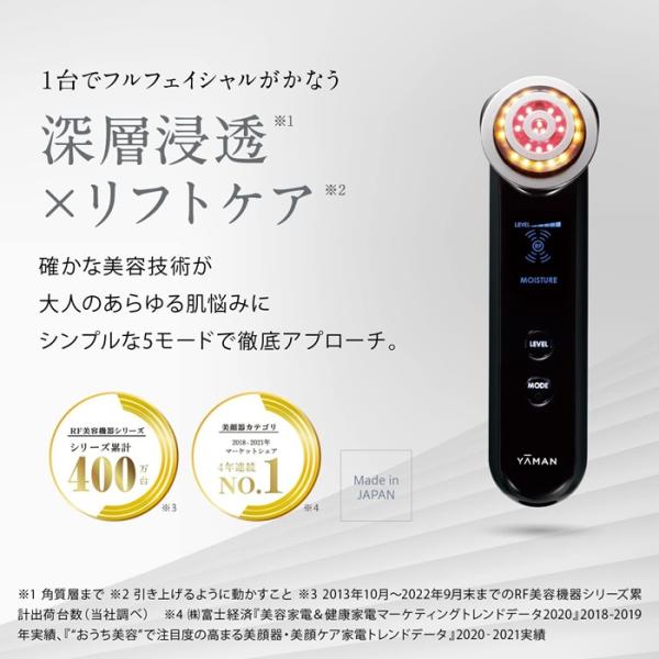 RFによる深部※加温、イオン導出による毛穴汚れのクレンジング、DYHPによるうるおい導入、高周波EMSによる表情筋の刺激、