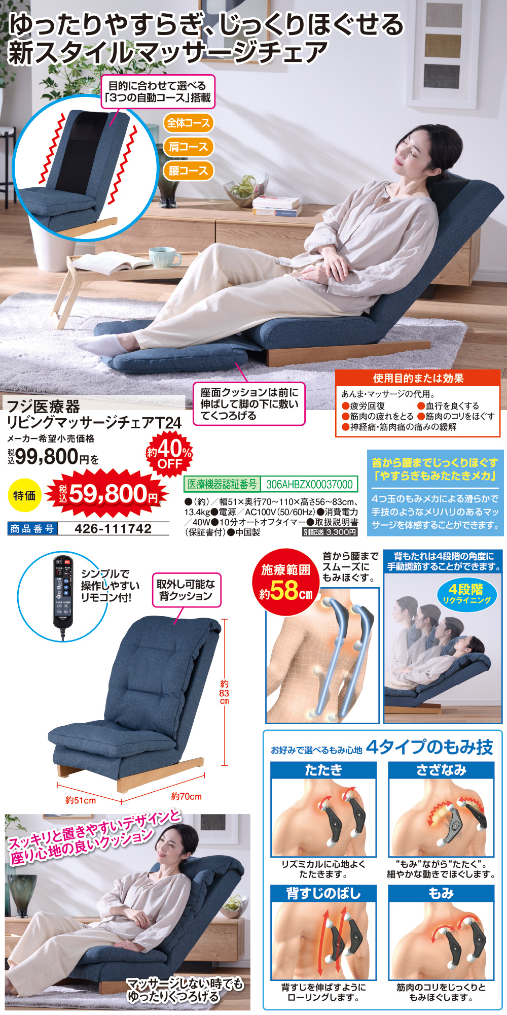 - 【 事前にご確認ください 】 商品詳細 メーカー フジ医療器 メーカー品番 TR-Z1 薬事分類 管理医療機器 販売名 リビングマッサージチェア T24 認証番号 306AHBZX00037000 サイズ(約) 本体寸法(クッション含む):幅 約51×奥行 約70×高さ 約83cm(リクライニングしていないとき)幅 約51×奥行 約110×高さ 約56cm(リクライニングしたとき) 重量(約) 本体(クッション含む):約13.4kg 素材・原材料 張地:ポリエステル 生産国 中国製 関連キーワード:a10313 フジ医療器 マッサージチェア マッサージ チェア マッサージ機 マッサージ器 腰 肩 首 疲れ コリ 疲労 リクライニング 筋肉疲労 疲労回復 血行促進 リフレッシュ 家庭用 リラクゼーション リラックス 健康器具 健康 ほぐし ほぐす のばし 伸ばし ストレッチ やすらぎ 手技 座椅子 肩位置調節 簡単 カンタン リモコン クッションゆったりやすらぎ、じっくりほぐせる。マッサージチェア ゆったりやすらぎ、じっくりほぐせる。新スタイルマッサージチェア 落ち着きのあるファブリック生地と温かみのある無垢材の木脚を使用した、スタイリッシュかつコンパクトなデザインのチェアに、首から腰までじっくりほぐす「やすらぎもみたたきメカ」を搭載したマッサージチェア。一見するとおしゃれな座椅子に見えますが、首から腰までの広範囲をしっかりとほぐすことができるメカユニットを搭載しており、手技のように滑らかでメリハリのあるマッサージをお楽しみいただけます。 リビングにも和室にも馴染むデザインなので置く場所を選ばず、マッサージをしない時でもゆったりと寛ぐことができます。好きな時に好きな場所で、ゆったりと体を預けながら身も心もほぐされる癒しのひと時をお過ごしください。 手技のようなマッサージを実現する「やすらぎもみたたきメカ」 首、肩から腰まで最大約58センチの広範囲をしっかりほぐすことができるメカユニットを搭載。「もみ」「たたき」「さざなみ」「背すじのばし」の4タイプからお好みのもみ技をお選びいただけます。 4段階のリクライニングを倒しても首や肩にしっかり沿ってマッサージがフィットするように設計した独自のフレームを採用。また、肩の高さも3段階から調節できるので、リラックスした姿勢でじっくりとマッサージをお楽しみいただけます。 体調や疲れに合わせた3つの自動コース 目的に合わせて選べる「3つの自動コース」を搭載。その日の体調や疲れの部位に合わせて「全体」「肩」「腰」の3つのコースからお好みのマッサージをお選びいただけます。 ● 全体…背中全体のコリや疲れをやわらげるコース ● 肩…肩/背部のコリや疲れをやわらげるコース ● 腰…腰部のコリや疲れをやわらげるコース シンプルLEDリモコンで操作もカンタン。残り時間もひと目でわかります。 スッキリと置きやすいデザインと座り心地の良いクッション クッションは落ち着きのあるファブリック生地、木脚には温かみのある無垢材を使用。一般的なマッサージチェアと比べて見た目の圧迫感も少なく、リビングでも和室でもインテリアに溶け込むスタイリッシュなデザインです。また、本体幅約51センチ、高さ(最大)約83センチの「省スペース設計」なのもうれしいポイント。 座りやすさや座り心地にもこだわっており、背もたれは4段階のリクライニング機能を搭載。また、床から座面まで程よく高さを出すことで、立ち上がりやすく、座りやすい設計になっています。 心地よく体を包み込むような厚みのあるクッションは着脱式。マッサージをしない時には座椅子として、ゆったりとおくつろぎいただけます。