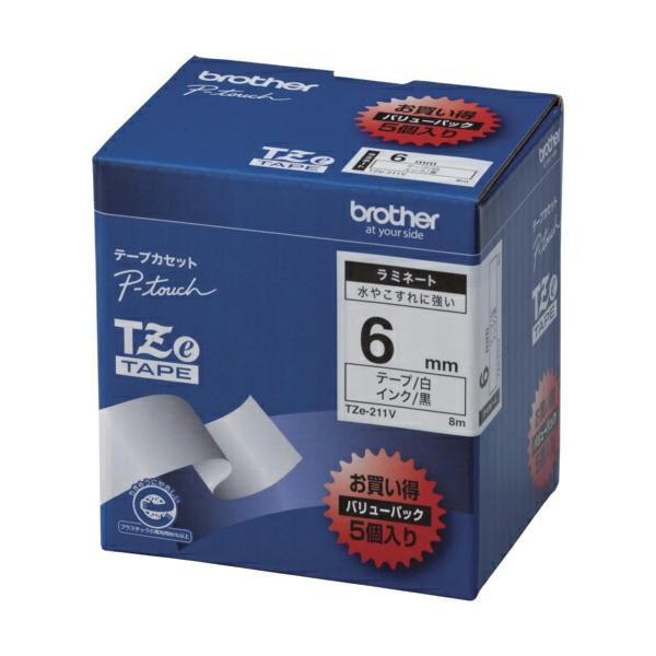 ブラザー Tzeテープ 黒文字/白地/6mm (お徳用パック5個入) ( TZE-211V )