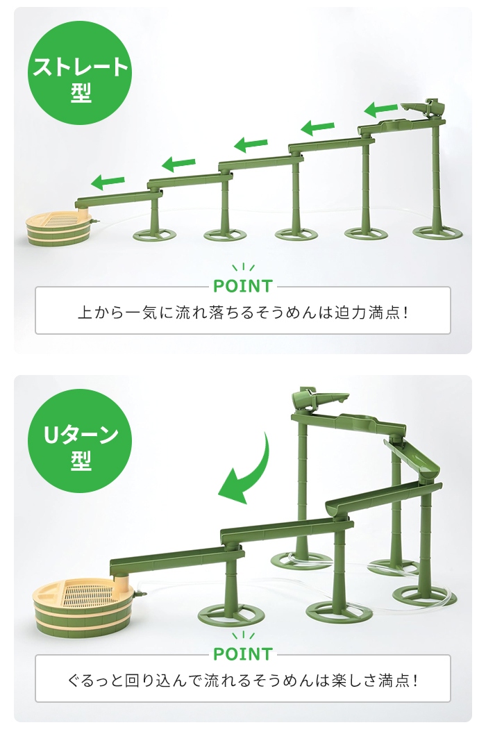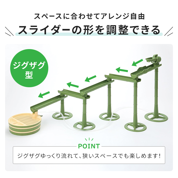 - ▼ 商品情報竹風の色味とデザインがかわいいそうめん流し器。組立簡単、Uターン型・ジグザグ型・ストレート型、お好きな形にカスタマイズして使えます。スライダー部は最長約160cmにも!水の重みでカコンッとかたむくししおどし付きでムード満点。電動ポンプで水を自動組み上げできます。スライダーを滑りおりてくるそうめんをキャッチ、うまく取れなくてもザル付き桶に流れ落ちるので、ゆっくりいただけます。薬味も置ける目皿付き。電池式(別売り)なので野外でも楽しめます。▼ 本体サイズ(約)幅182.5×奥行26.5×高さ57.5cm(最長時)▼ 重量(約)1.73kg▼ 素材・材質[樹脂部]ポリプロピレン [チューブ]塩化ビニル [電池ボックスパッキン・スタンドパイプ内部シリコン]シリコーンゴム▼ 仕様・電源:アルカリ単1形乾電池1.5V×2本(別売り)・連続使用時間:約30分(条件により異なります)▼ 商品内容最上段スライダー、スライダー×4、ししおどし、竹節×10、スタンド脚×4、スタンド脚大(チューブ差込口あり)、チューブキャップ×2、チューブ、スタンドポール6cm・13.5cm・21cm・28cm、スタンドポール40cm(内部シリコン付)、目皿、桶▼ 生産国中国▼ ご注意ください※電池は別売りです。▼ 同シリーズ〔同タイプ〕・ 竹・ スライダー・ ツイスト※このページは[そうめん流し器 竹]を販売しております。〔特集〕● そうめん流し器特集▼ キーワード流しそうめん機 そうめん流し器 流麺 スライダー 流しそうめん器 そうめん流し機 電池式 自動くみ上げ ファミリー用 卓上 そうめん 流しそうめん セット そうめん流し そうめん流し器 竹 可愛い オシャレ 自動 ししおどし ざる電池式 おしゃれ 大型 子供 流れるそうめん 変形可能 キャンプ アウトドア 屋外 野外 家庭用 素麺 誕生日会 夏 パーティ お盆そうめん流し器特集