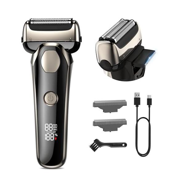 ・【フローティング3枚刃・密着ヘッド・肌に優しい極薄網刃】往復式電動シェーバーは、フローティング3枚刃を搭載し、刃が上下・前後に動くことで、肌の凹凸にしっかりとフィットし、一度の動作で複数の毛を捉えることができ、効率的にひげを剃ります。さらに、超薄型のステンレス製網刃を採用し、肌にかかる圧力を軽減しながら、様々な向きに生えるひげを正確にキャッチして素早く深剃りします。低アレルギー性のステンレス外刃の組み合わせにより、耐久性と肌へのやさしさを実現しています。お肌が敏感の方にも楽々使用できます。これにより、毎日の髭剃りにかかる時間を短縮し、快適な剃り心地を提供します。